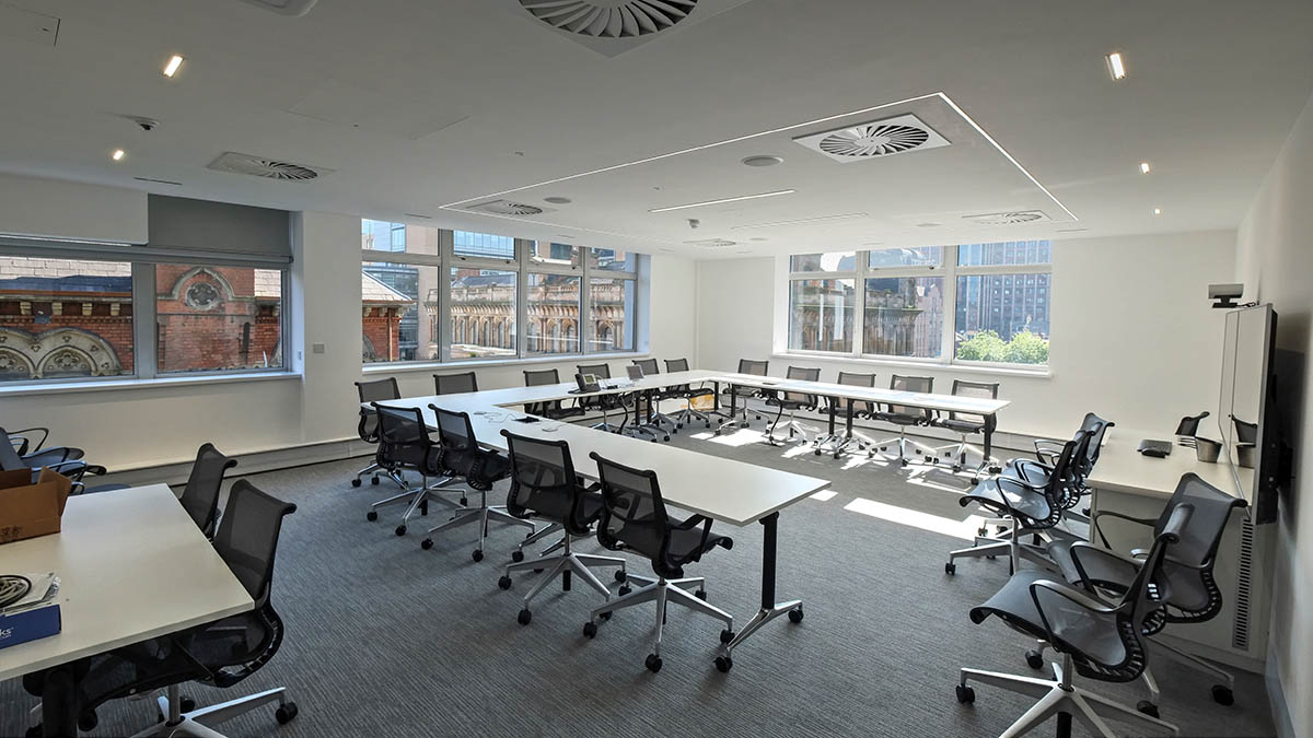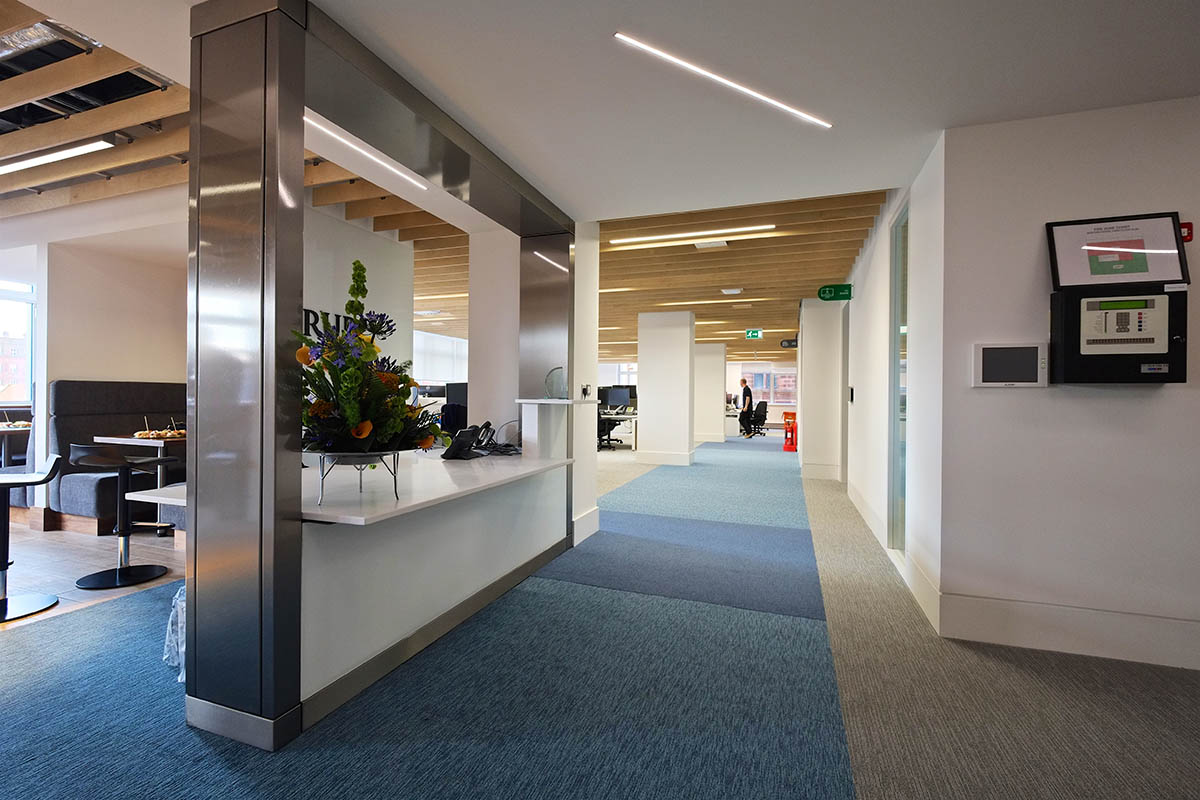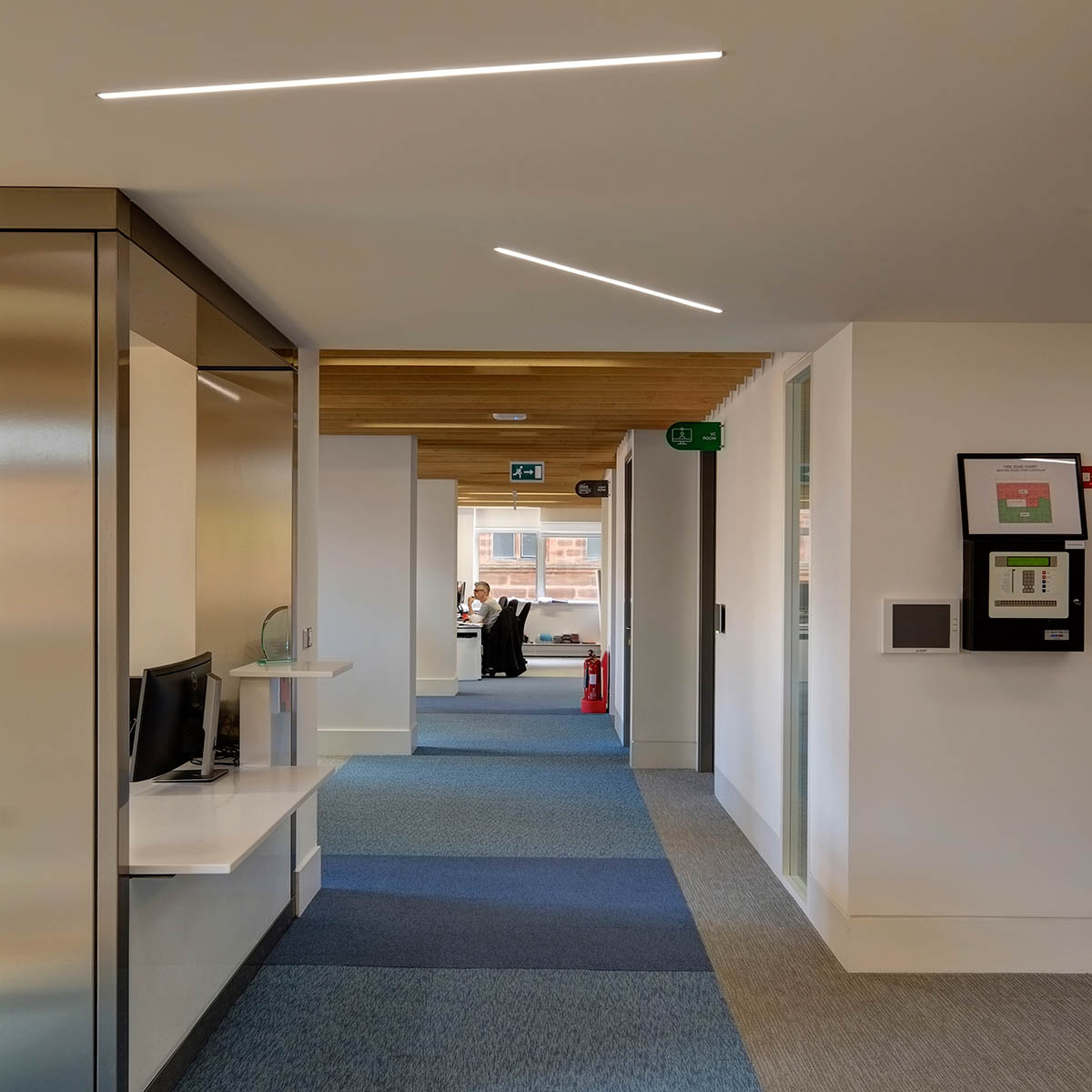 For its new headquarters in Belfast, the Arup Group has purchased an entire floor of Bedford House, a prestigious building in the city centre. To be more precise, the owner did not simply sell an empty space, but rather offered Arup the opportunity to create a made-to-measure space, specifically designed and fitted out to meet its own requirements. The lighting system has been created with particular care as lighting is one of the design services provided by Arup and its offices are therefore an example of its own planning and design skills. The environment's bright and lively atmosphere has been created by Chroma Lighting in close collaboration with Arup Engineers, Jan Madill, the architect with whom the owner of the building has a long-standing relationship and the Dowds Group (Electrical Contractors). Most of the offices are lit with modular 600mm recessed luminaires that provide the general lighting. In certain common areas decorative pendant luminaires have been installed, whereas the coffee break zones are lit with Deep Laser recessed luminaires. Underscore and Laser Blade systems have been used for the meeting rooms whereas the linear devices used for general lighting have been inserted between the wooden slats that decorate the area in which the Group's construction services are presented, as this is a particularly important aspect of Arup's work. Another meticulously designed detail is the way Underscore aluminium tracks have been inserted between slats of wood of the same width for the ceilings in certain transit areas. Underscore devices have also been fitted in other transit zones with concrete ceilings. Thanks to these solutions Arup employees are able to show off a wide range of their design solutions.