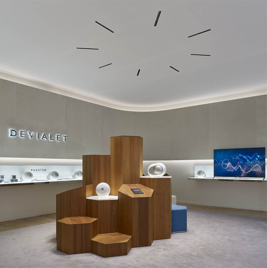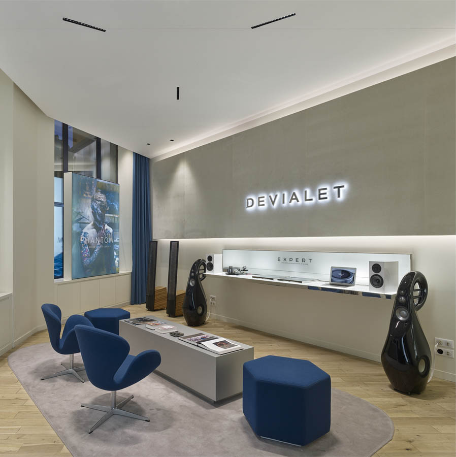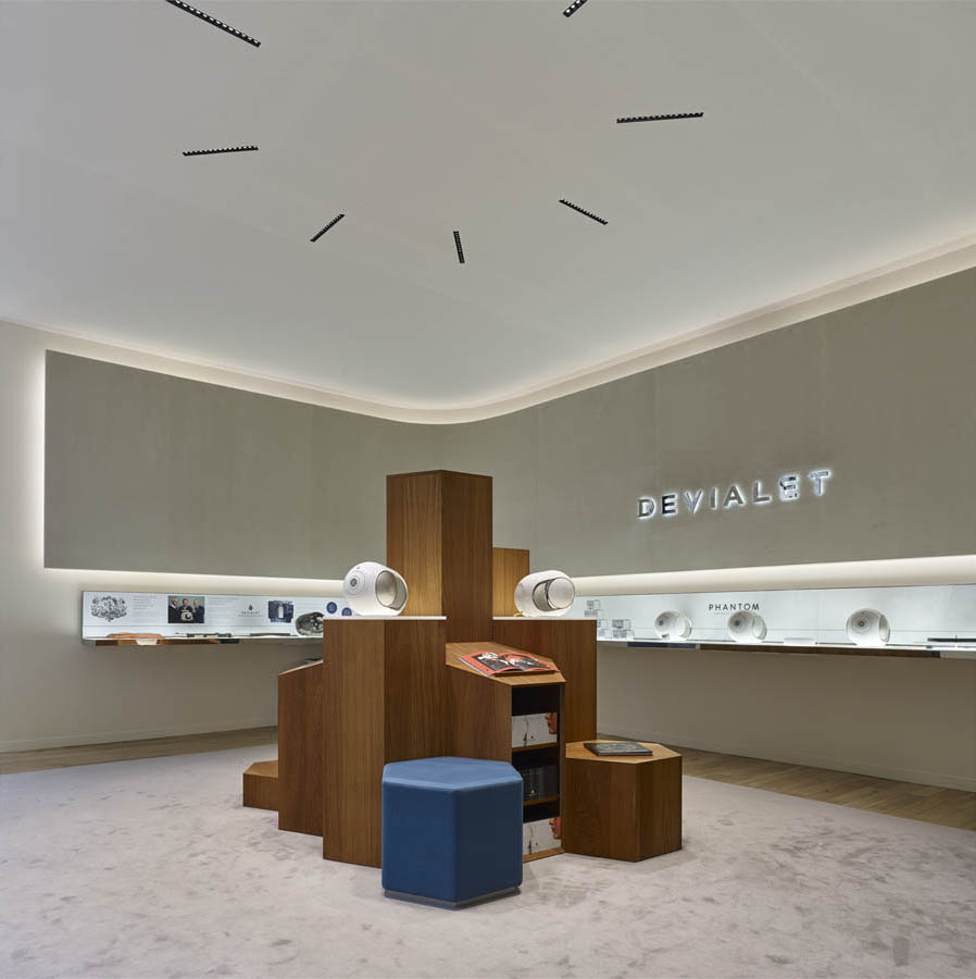 Devialet is the most highly awarded start-up in the world for the excellence of its audio sector technology. And to mark the launch of its Phantom wi-fi system, a genuine new development in this market sector, the company has revolutionised its entire store concept. The mission was to integrate the brand’s new communications campaign into the architecture of its store spaces and offer the chance of two different acoustic experiences: a sit-down listening experience in a private lounge featuring its “Expert” range; and a more informal listening experience with its “Phantom” range where customers can walk around in a more open and flexible space.