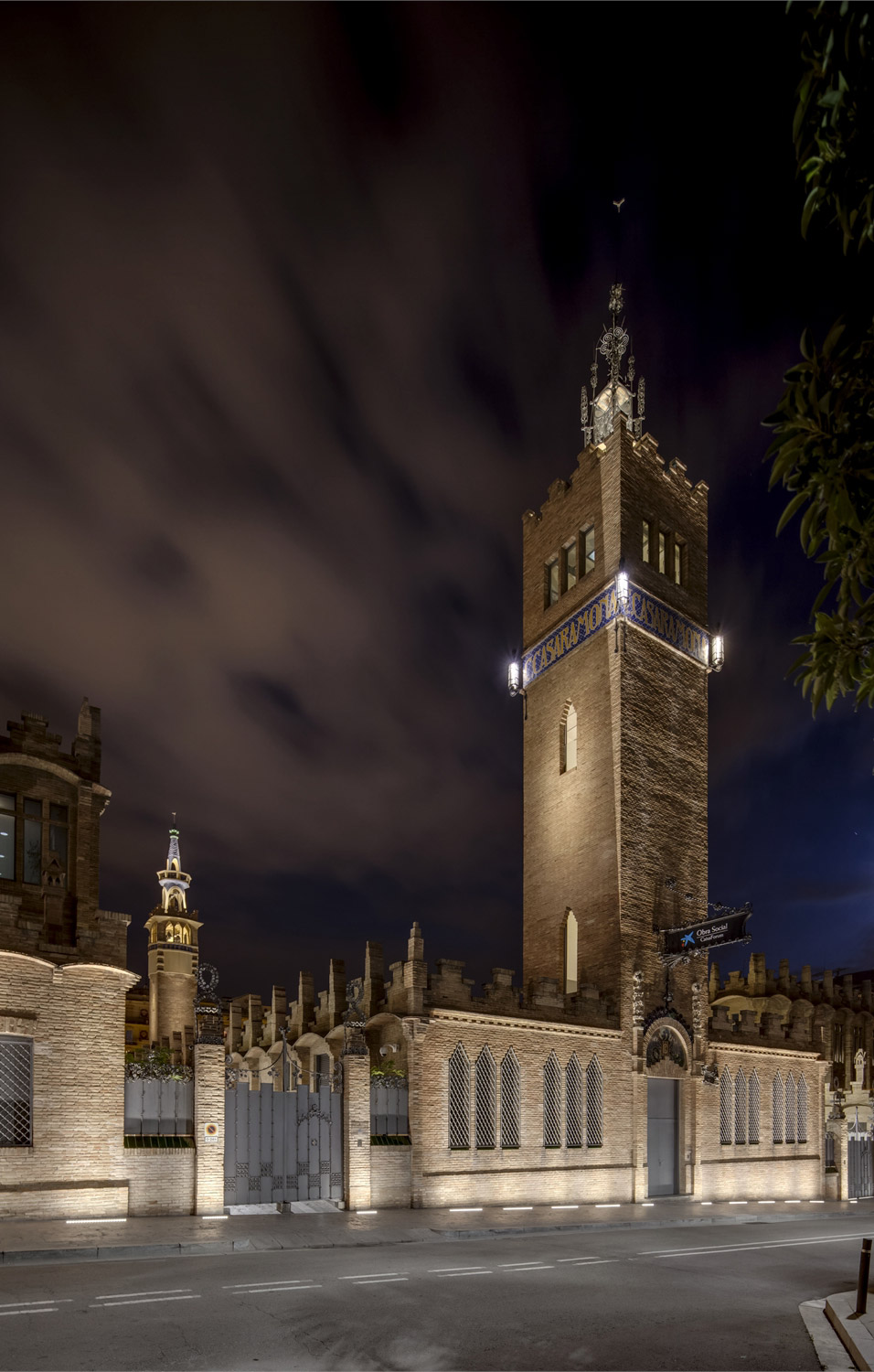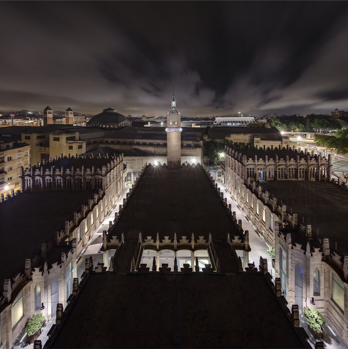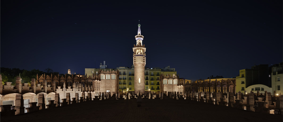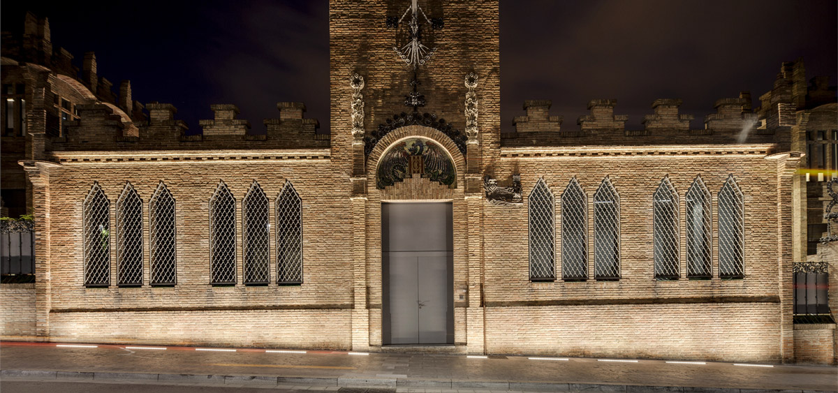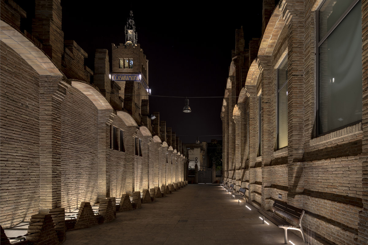 The outdoor lighting system was designed by AIA’s Albert Salazar and reMM’s Michela Mezzavilla with the aim of enhancing the monumental character of the complex, maximising the integration of light and architecture by concealing the luminaires and reducing energy consumption. In fact, the new system consists entirely of LED DALI luminaires connected to a control system that allows frequent scene changes. The brick facades are illuminated with a grazing light effect that highlights the decorative modernist details produced by Linealuce compact recessed luminaires with a wall grazing optic, a colour temperature of 3000K, CRI of 80 and a 27 W power rating. The dramatic effect produced by the Linealuce luminaires is mitigated, on the main facade in Avenida Marqués de Comillas and the elevation overlooking Calle Méxic, by general lighting created by Maxiwoody projectors mounted on the public lampposts. The projectors are fitted with 3000K colour temperature COB LEDs and a medium optic combined with accessories, such as refractors, diffusers and anti-glare filters that modulate the light according to requirements, including those dictated by the position of the devices. The DALI control system allows the ratio between the grazing light of the Linealuces