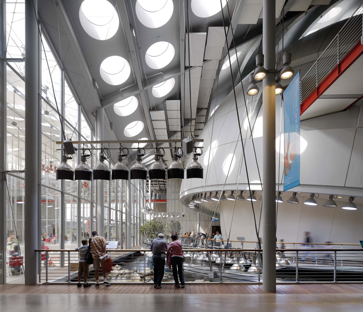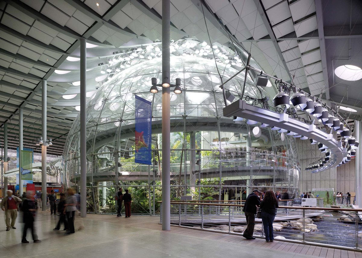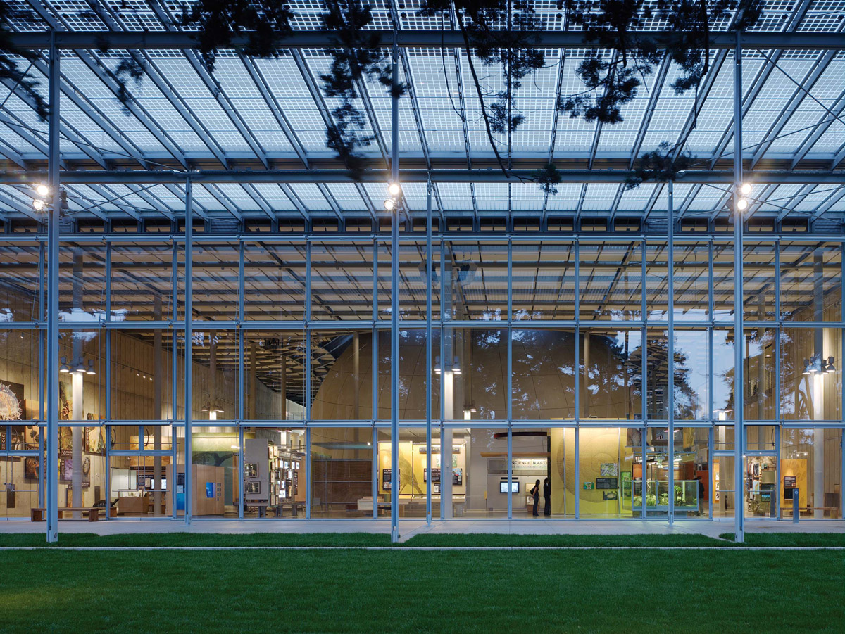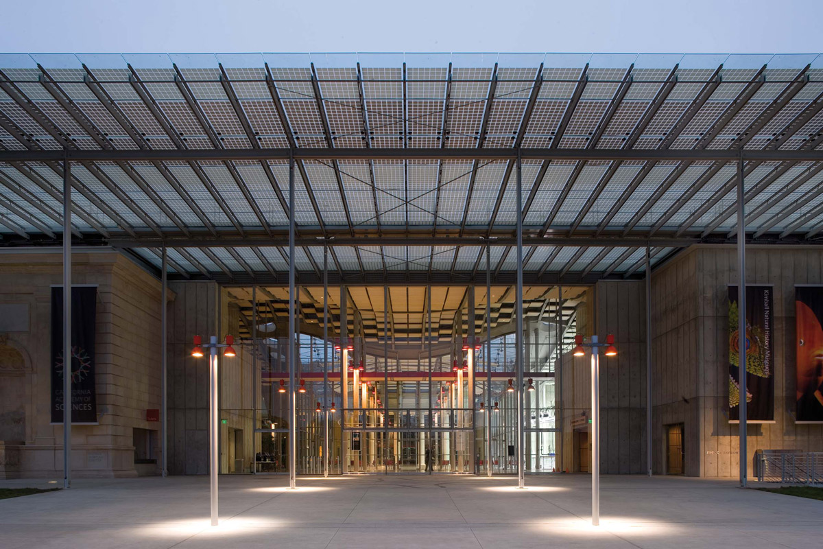 The California Academy of Sciences in San Francisco is one of the few natural science institutes combining public education directly with scientific research, conducted on site. The primary objective in deciding to remodel the new Academy was to expand its activities, and to enlarge the exhibition spaces and research centre, while also finding new and innovative ways to welcome and accommodate increasing numbers of visitors. The building houses a natural history museum, an aquarium and a planetarium, bringing together the themes of nature, science and civilization. The new Academy is fully integrated into its natural environment, the Golden Gate Park, and makes extensive use of energy saving techniques. The declared mission of the Academy is to “Explore, Explain and Protect the Natural World” creating the ideal premises for the development of sustainable design strategies. Choice of materials, recycling, exploitation of natural light and natural ventilation, the utilisation of water, including the recovery of rainwater, and energy production were all design issues that would become an integral part of the overhaul, helping ultimately to secure Platinum certification for the museum under the LEED programme. Some of the old buildings were demolished, reduced to rubble and reused in the new structures. Wall insulation was made from scraps of denim cloth provided by Levi Strauss & Co. 95% of the steel utilised came from recycled material. Three of the existing buildings - the African Hall, North American (California) Hall and Steinhart Aquarium - were reclaimed and rebuilt in their original volume. The new building retains the position and orientation of the original Academy and all the attractions are organised around the central piazza. The dome of the Planetarium and the rainforest biosphere flank the piazza on either side. This is the point interlinking all sections of the museum together, and is covered by a glass roof with a lattice structure suggestive of a spider’s web. The centre of the structure is open to the sky. The features of the piazza also combine to provide an ideal venue for concerts and other events. The roof formally unifies the organism as a “living structure”, covered with a shallow layer of soil providing a bed for 1,700,000 small plants selected to survive in the microclimate of the Golden Gate Park without the need for fertilizers or artificial irrigation systems. Whilst the vegetation is decorative, it also serves a practical purpose: the moisture in the soil has the effect of lowering the temperature inside the museum by 5 or 6 °C, and this - uniquely in the US - means that there is no need for air conditioning in the public spaces on the ground floor, for in the research offices along the façade. 15% of the museum’s electrical power requirement is produced by 55,000 photo voltaic cells, sandwiched between two sheets of glass, which make up a transparent canopy around the perimeter of the living roof. The fixtures used by Renzo Piano for this project include Le Perroquet in a special outdoor version, used also at the High Museum of Art in Atlanta, coloured grey and red.