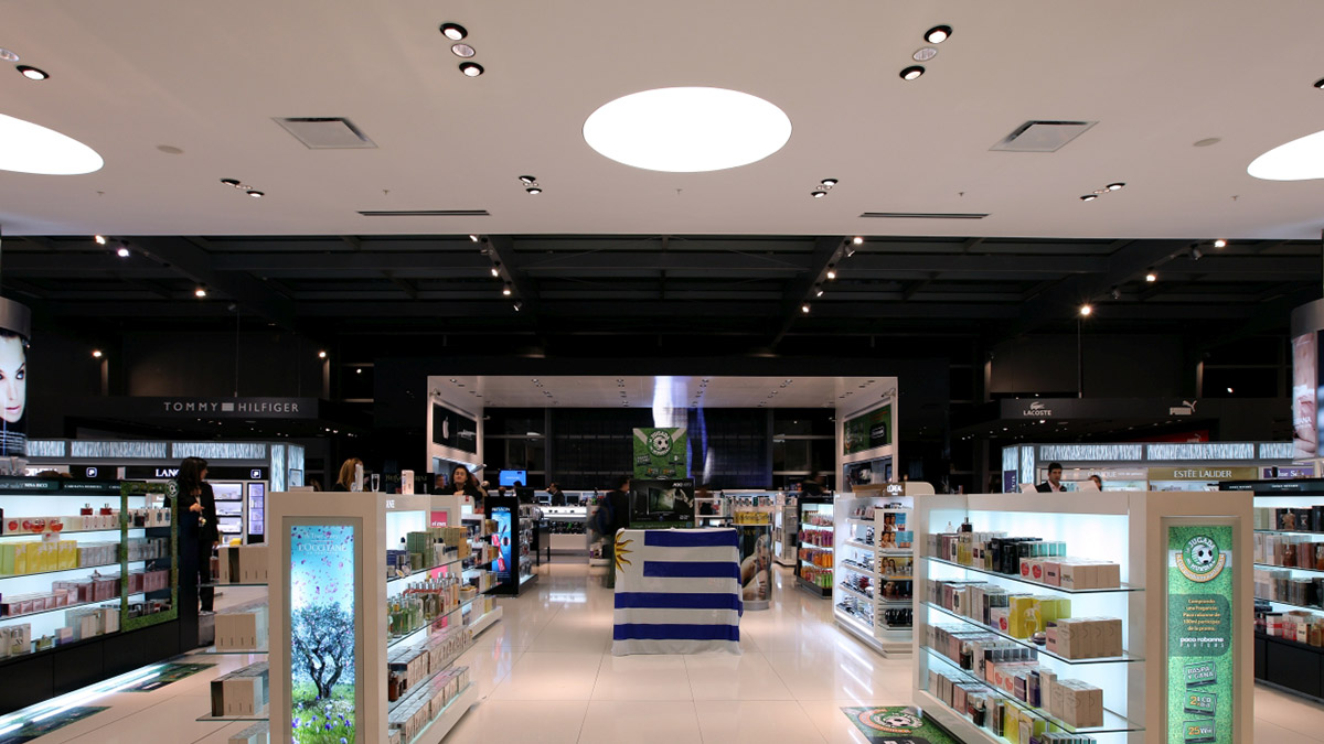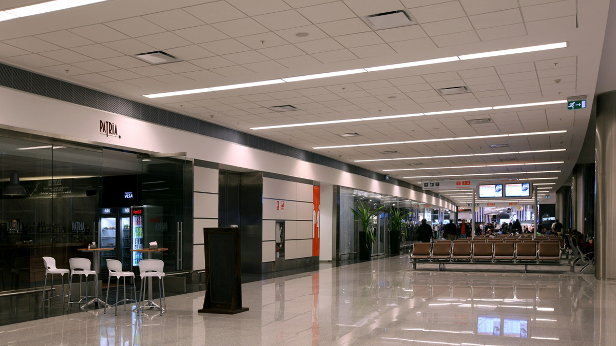 The main lighting design guidelines were: show off the main architectural elements, satisfy the requirements of the Specifications and guarantee a high degree of energy efficiency (although there are no local standards relating to this). The main architectural element to be shown off was the roof, 350 metres long (150 metres interior) and almost 80 metres wide at the centre. Under the roof are the Departures Hall and the airport Terrace, from which people accompanying travellers can watch the aeroplanes take off. In terms of requirements, the specifications indicated lighting levels much higher than international standards, a feature which necessitated a search for high efficiency lamps, mainly fluorescent and discharge lamps with a very good chromatic yield as well as electronic ballasts, which would not increase energy consumption. The types of lighting were identified based on the functions performed in the various areas of the airport: departures hall, check in desks and terrace, as well as lighting for the roof; all boarding and pre-boarding areas: immigration control, boarding hall, baggage hall, customs, arrivals level; shopping areas. The lighting for the Departures Hall and the Terrace, both located under the building's huge roof, was created indirectly by reflection off the roof. For these areas the specifications required a light level of 300 lux, therefore, around 280 asymmetrical spotlights were used, not supplied by iGuzzini, with 400 W metal halide lamps, mounted on the structure supporting the roof. Considering that the internal area of the building. lit with these spotlights measures around 10,000 square metres and the power used for them is 136 kW (including leakage in the ballasts), the resulting density is 14 W per square metre which, although the lighting is all indirect, lies within acceptable energy efficiency values. The rest of the roof (areas outside the building) were lit with the same type of spotlights, although fewer of them, totalling 370 lamps for lighting the whole roof. Parts of these outer areas consists of access routes to the Departures level which are lit only by reflection from the roof and for which the average light level of 80 lux was planned and achieved. The zones for immigration control, boarding areas, baggage collection, customs and access levels were lit with continuous lines of Lineup and Sistema Hub fluorescent tubes. T8 tubes between 36 and 58 W were used, and electronic ballasts. In the check in area Lineup luminaires were used to light the wall and the area surrounding the baggage conveyor. The average light levels required in the specifications for these zones were very high (600 and 300 lux) and were achieved very efficiently with just 15 W per square metre and 7.5 W per square metre. Shopping areas were set up with a combination of down lights and two spotlights recessed in the ceiling with 35, 70 and 150 W (depending on the height) metal halide lamps. The Reflex and Frame luminaires were fitted in these areas. Green areas are picked out by Woody luminaires with halogen lamps. Outside areas for access to the departures level and the terrace on the upper level are indirectly lit with 150 W MaxiWoody luminaires with superspot optic and lenses for elliptical light distribution. The VIP lounge access area has Balisage LED luminaires. The Presidential zone is lit with Lingotto spotlights, for direct and indirect lighting, and 250 W Platea luminaires.