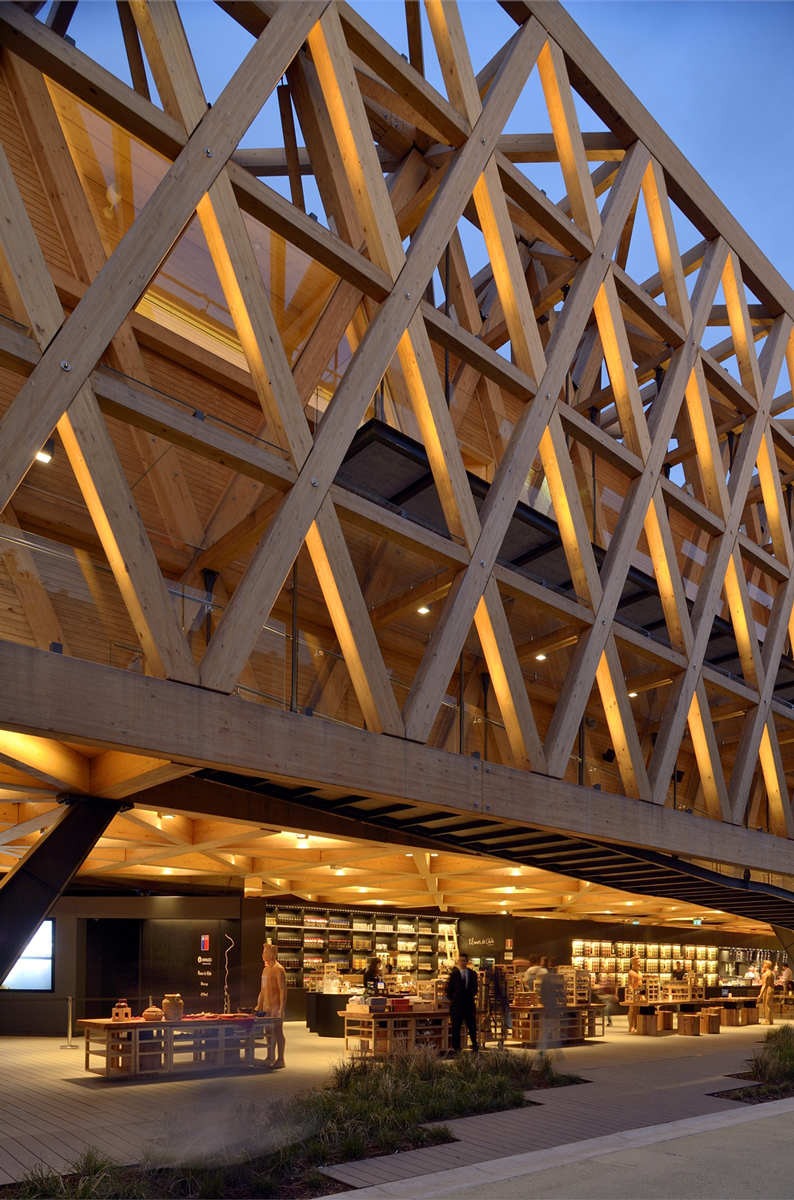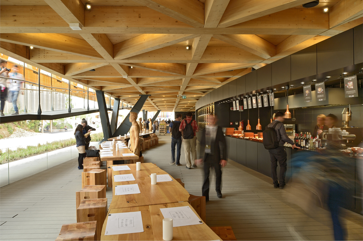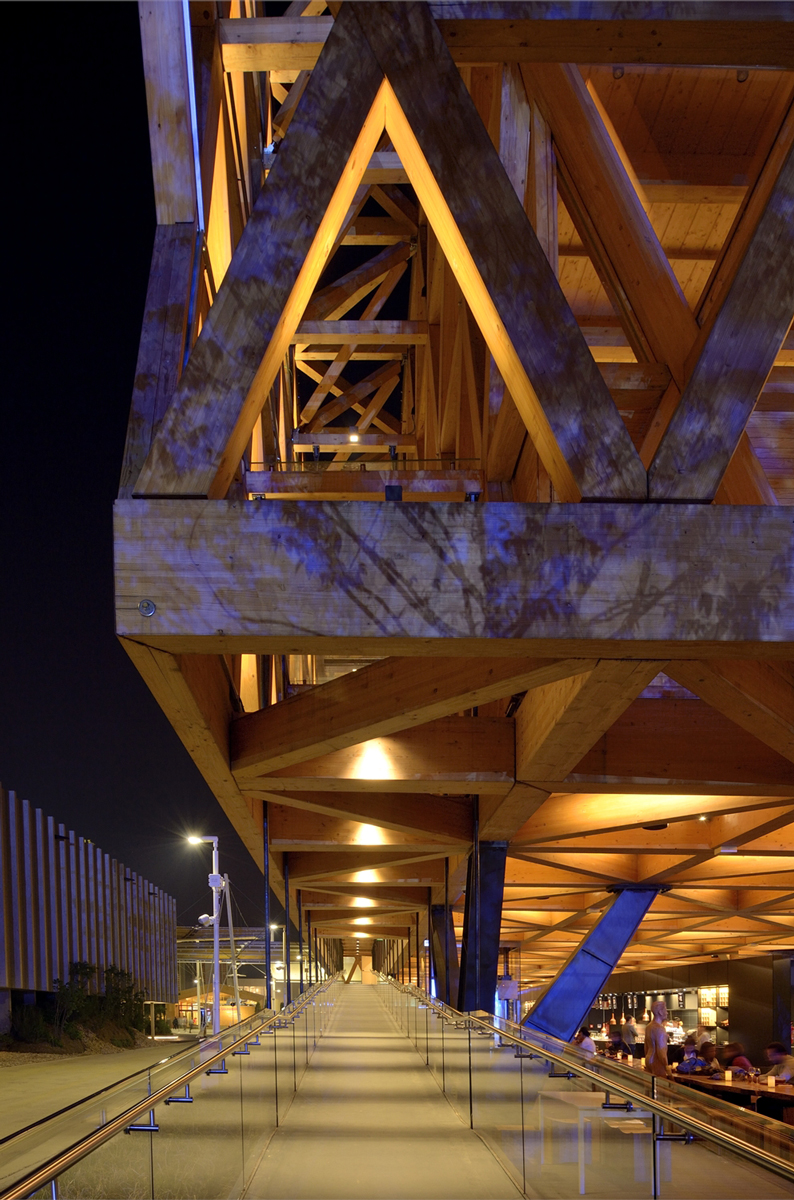 The lighting project is the work of the Chilean lighting designer, Maite Zubicoa, who has opted to highlight the wooden façade and ground floor ceiling only. In the remaining space there is no artificial lighting given that images of food and their geographical origins are projected continually, as if it were a cinema. At night the structure looks like a huge lantern lit only from the inside. The pavilion’s wooden framework is lit by iPro spotlights positioned in the individual triangular cells of the structure, and a warm colour temperature was specifically chosen by the designer as it is particularly suited to wood. Maite Zubicoa also selected non-invasive luminaires that blend into the architecture while also highlighting its shape and form.LED lamps were used to reduce consumption levels, and significantly, only 20KW/h is required to light the whole building.