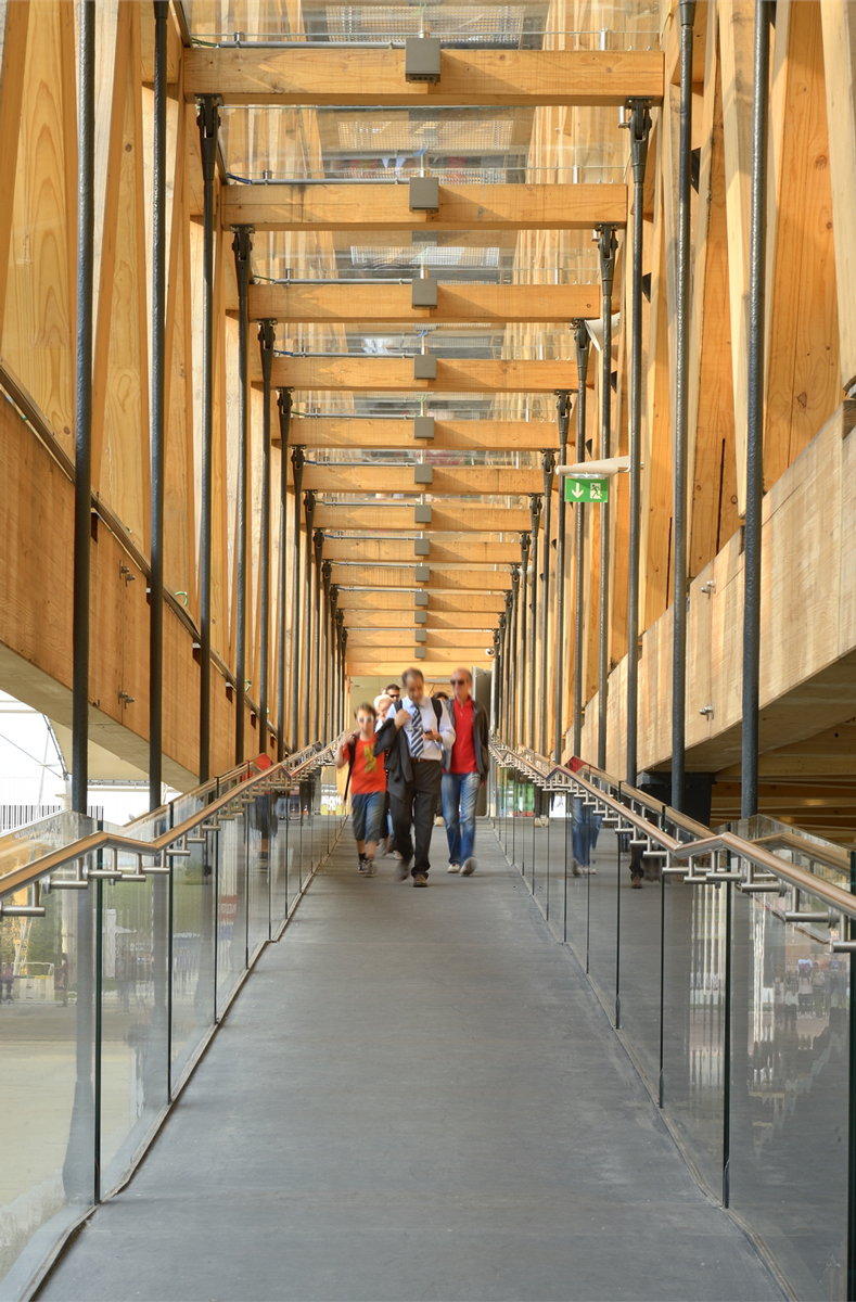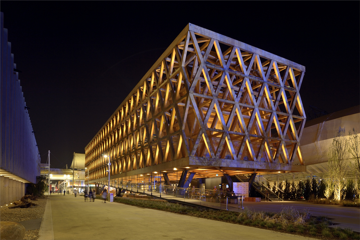 The main goal of the Chile Pavilion is to show millions of Expo visitors this country’s extreme geographical diversity: from the Atacama Desert to Patagonia, and from the central green valleys to the eastern islands. These very different regions are described through their ecosystems and how these ecosystems are being preserved. To house this concept, the Chilean architect, Cristián Undurraga, has designed a suspended structure covering almost 2000 m2. It consists of a large wooden lintel enclosed by a frame of criss-crossed beams and supported by four concrete pillars that create an intermediate space.