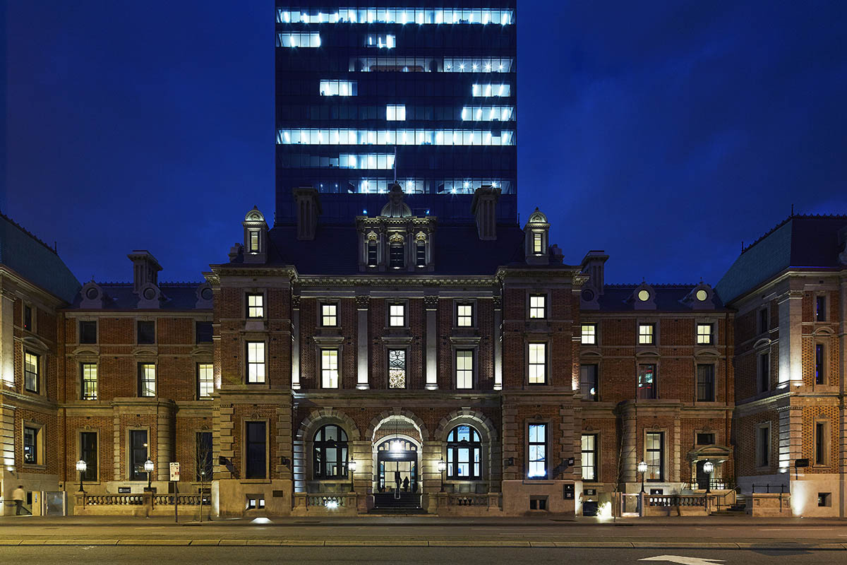 This sense of balance is also present in the interior and exterior lighting systems that both feature iGuzzini luminaires. iGuzzini devices have been used to highlight the facades of the historical buildings, as well as the new, adjacent glass structure that houses the Mayflower restaurant.