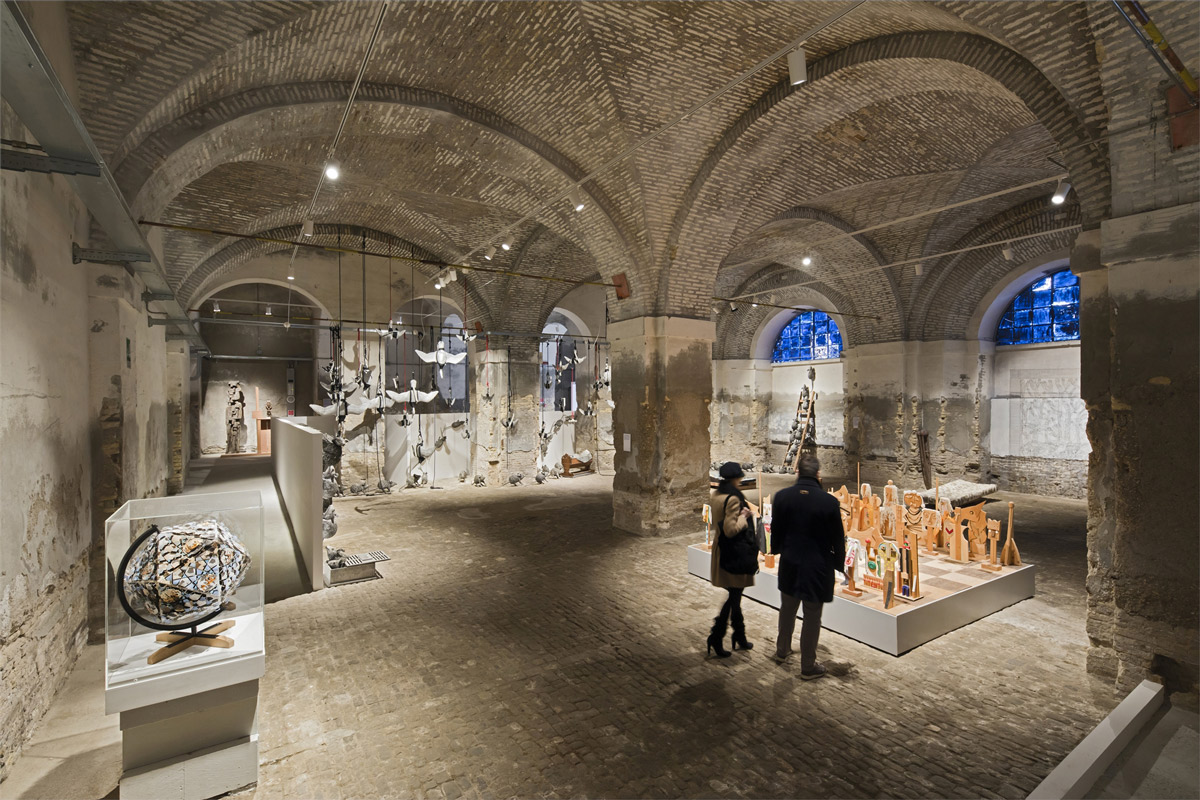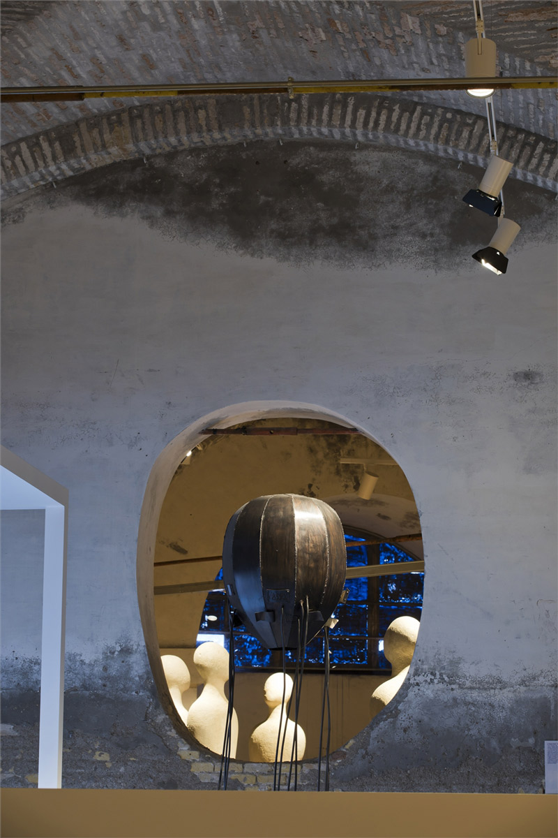 Palco luminaires. These devices were selected for their high degree of adaptability and their capacity to enhance a sense of aesthetic uniformity. The system's immense versatility derived from the track installation of the spotlights and the vast range of accessories available, which offered flexible highlighting and specific light effects for each individual artwork. The decision to use a warm colour temperature and a high colour rendering index also added to the exhibition's emotional dynamic by highlighting the different materials displayed and emphasizing the deliberately rough finish of the hollow brick backdrops and the timeworn surfaces of the architecture.