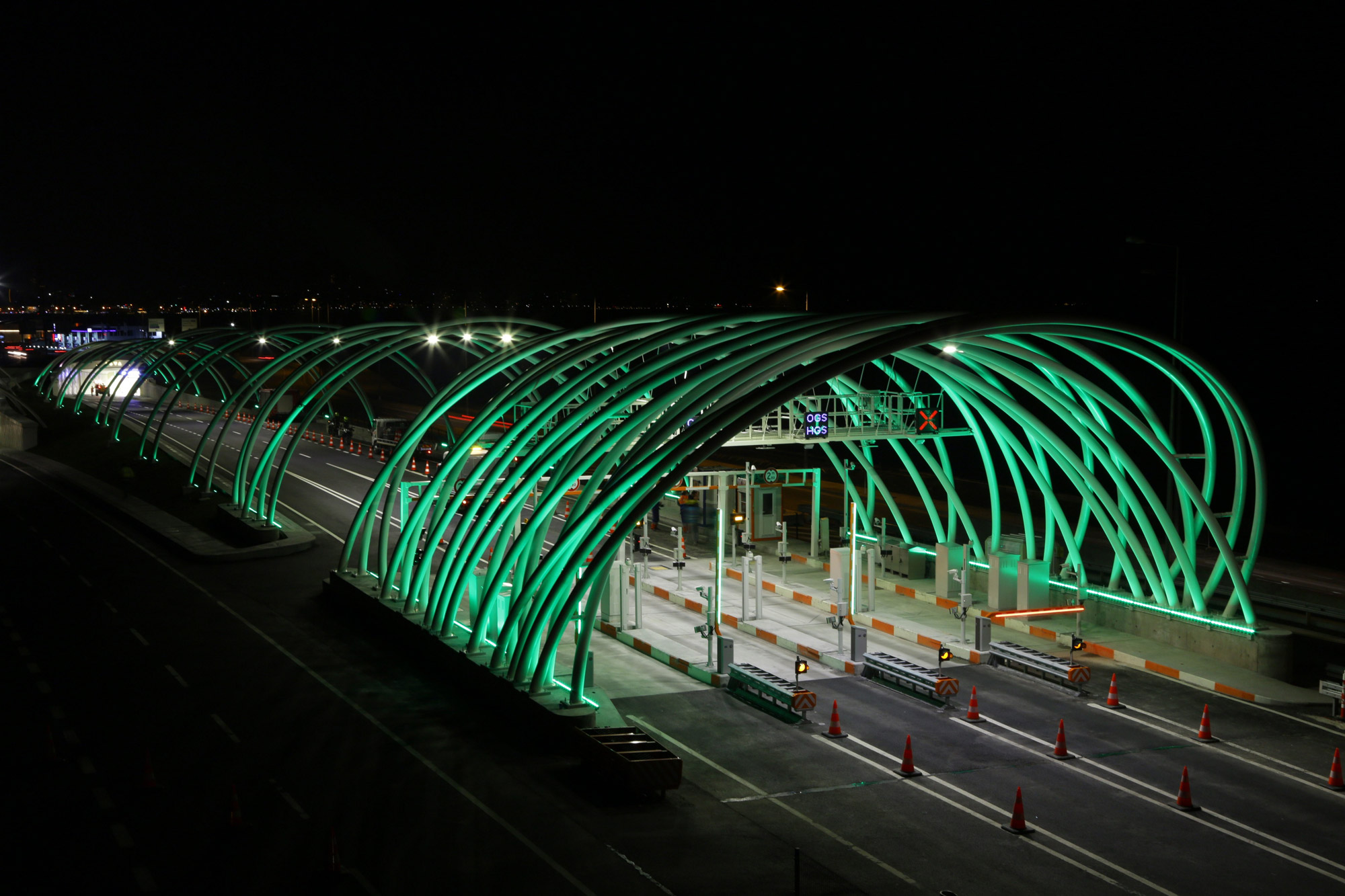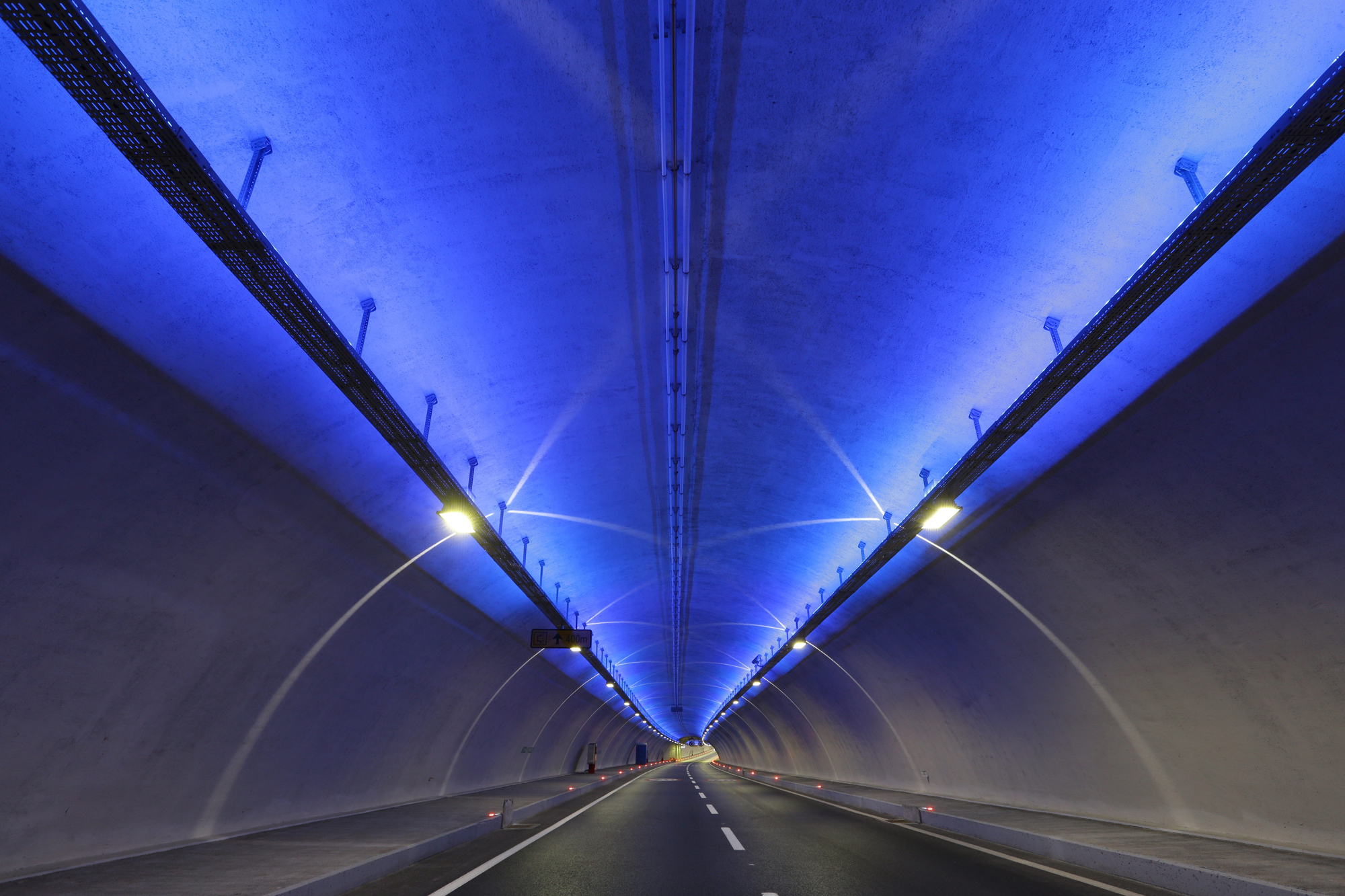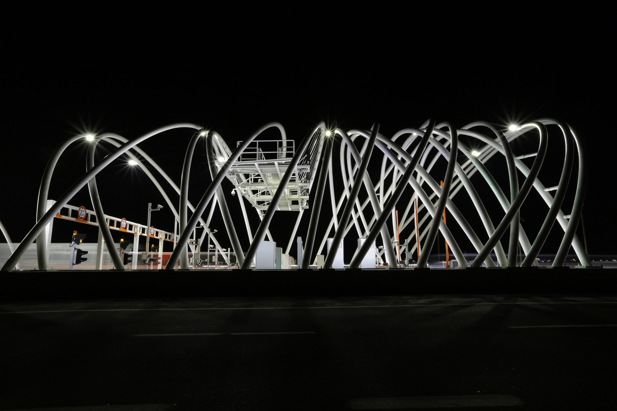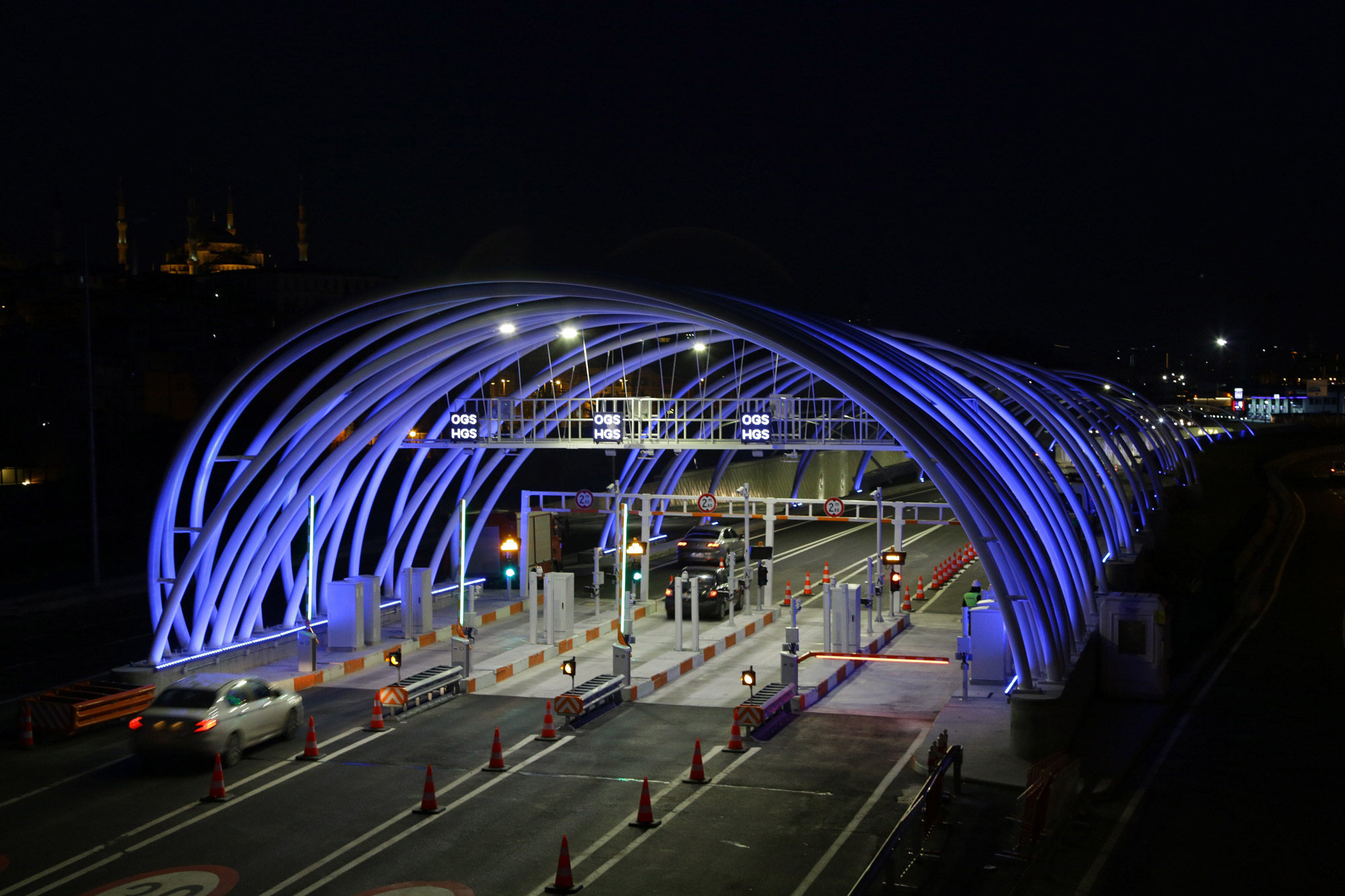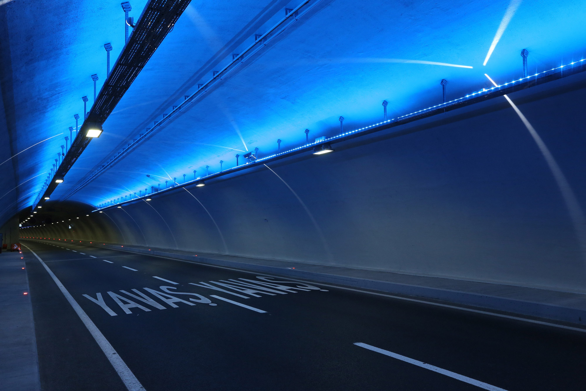 Dean Skira is based on lines of light and the colour blue. Blue was chosen after Skira made a careful study of traditional Turkish iconography. The interweaving lines, on the other hand, evoke the geometric patterns used as decorations on local carpets, tiles, windows and buildings. These looping lines of light inside the tunnel also influence driving rhythms as they are spaced at different intervals and therefore have different effects. The ones that are closer together transmit a sense of acceleration whereas those further apart seem to slow speed down. For the tunnel interiors, Dean Skira has created a blue background using RGB Ledtubes and then projected lines of light onto it using a combination of RGB Trick luminaires specifically designed for this project. One of the lines of light is created with a luminaire using 5000 K colour temperature LEDs, whereas the other 2 Trick devices produce a light blue line and a dark blue one. The tunnel, in fact, has two types of ceiling: a vaulted one for the upper deck and a flat one for the lower deck, but the pattern created by the light lines is the same for both. The tunnel also features curves and alternating dips and rises. The rhythm created by the light also varies between the start and the centre of the tunnel as the distance between the luminaires changes. At the start, for 750 metres, the luminaires are spaced at a distance of 3m (pattern 1), then for 500m they are spaced at 6m (pattern 2), then for another 750m the distance between them becomes 10m (pattern 3). This design, combined with the progressive spacing out of the loops, accentuates the idea of travelling in space and time, and makes driving through the viewless tunnel less monotonous. In the centre, the longest 1000m section of the tunnel returns to pattern 2 and then the loops move together again as the exit nears. The luminaires are fitted to the metal structure that runs along the whole length of the tunnel and contains the various system cables, which cannot be attached to the walls. A team consisting of Dean Skira, architects Dino Krizmanić, Leonid Zuban and the structural engineer Berislav Medić also designed the architectural structures for the toll plazas that feature steel arches that criss-cross at different angles and are projection-lit by RGB Linealuce luminaires which create a light effect that anticipates what awaits travellers inside the tunnel.
