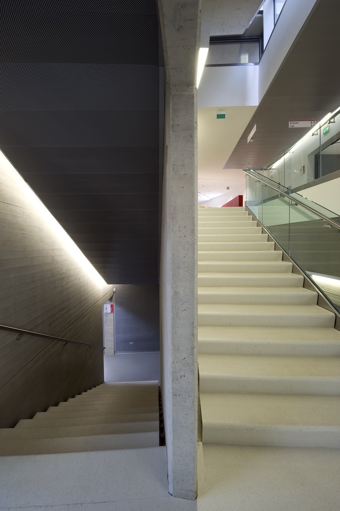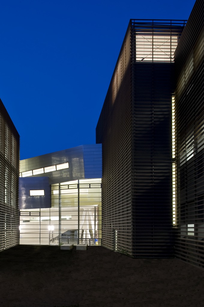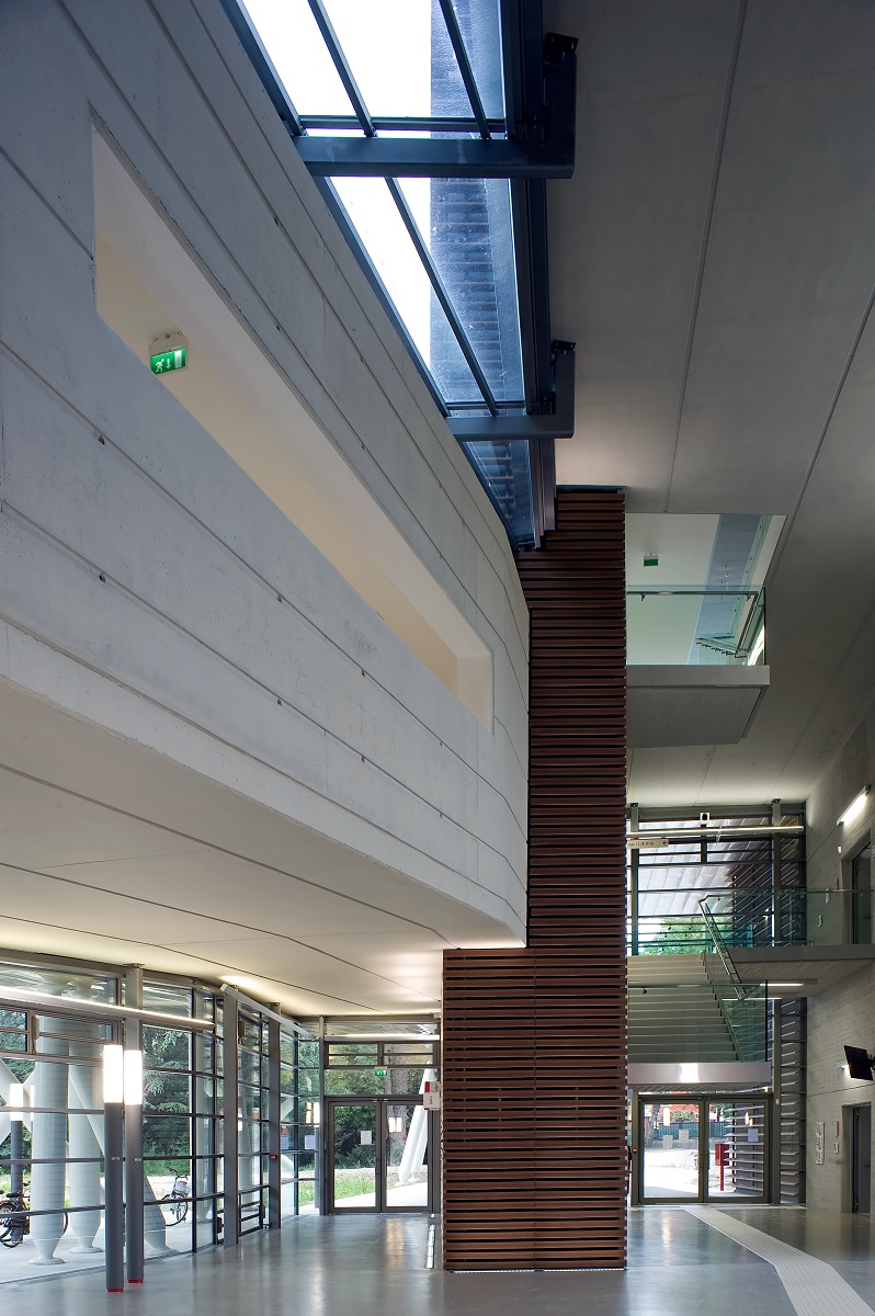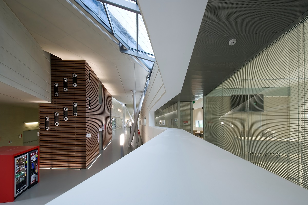 The former hospital in Forlì, a complex of early twentieth century pavilions on the edge of the town's historic centre, has recently been converted into a University Campus. The project, ordered by the Municipal Administration, was preceded by a two-stage international design competition organised by the Forlì Municipal Authorities in 1998, and the winning team consisted of the following architects: Lamberto Rossi, Massimo Galletta, Roberto Lazzarini, Marco Tarabella and Paolo Zilli. The project involved iGuzzini providing its products and know-how in the construction of the lighting system designed by the architectural studio. The artificial lighting system had to be efficient, guarantee the lighting levels required by the various contexts and highlight the architectural structure of the complex. The product used to light the lobby has been specifically designed for this context. “Fiammifero” is basically an industrial production bollard in a range of 3 different sizes and powers. One is 2 metres high with LEDs and 99 W of power, and another is 2.60 metres high with a power of 99 or 65 W. The diffuser screen is made of satin-finish methacrylate. This luminaire provides general lighting in the lobby area, aided by an indirect light component that combines iN60 luminaires installed at a 30° angle and Linealuce luminaires that create a grazing effect on the lift access area. Further light is provided by Reglette luminaires, installed in the grooves in the suspended ceilings along the corridors. White light LED Linealuce devices are installed in the same way on the stairs. The colour temperature used for the entire building is 4000K and all the luminaires are controlled by a DALI system that allows the integration of natural and artificial light to be monitored. The interiors of the 9 lecture halls are lit by Lineup luminaires managed by a control system and fitted with a sensor that indicates faults in the emergency lamps too.