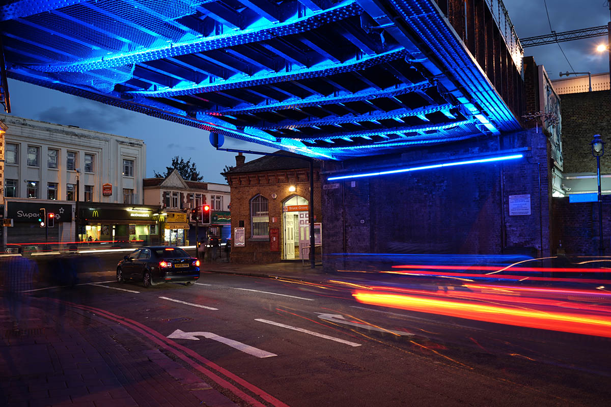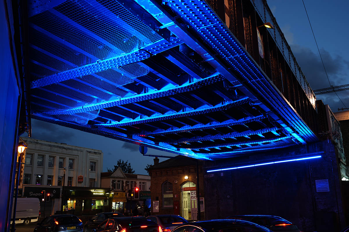 Working closely with local stakeholders, Adams & Sutherland decided to turn this rundown structure into a positive feature. The bridge was repainted in blue and the name of the station is now emblazoned across it, giving it an identity as well as providing direction. Sutton Vane Associates, supported by the environmental engineers Freeman Beesley, were then given the task of maximising the restoration of the bridge at night. The plan was simple: to bathe the underside of the bridge in blue light to reinforce the effect of the new paint, and transform it into a beacon that is fast establishing itself as a local landmark.