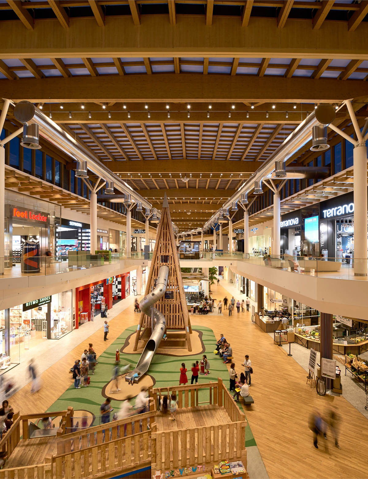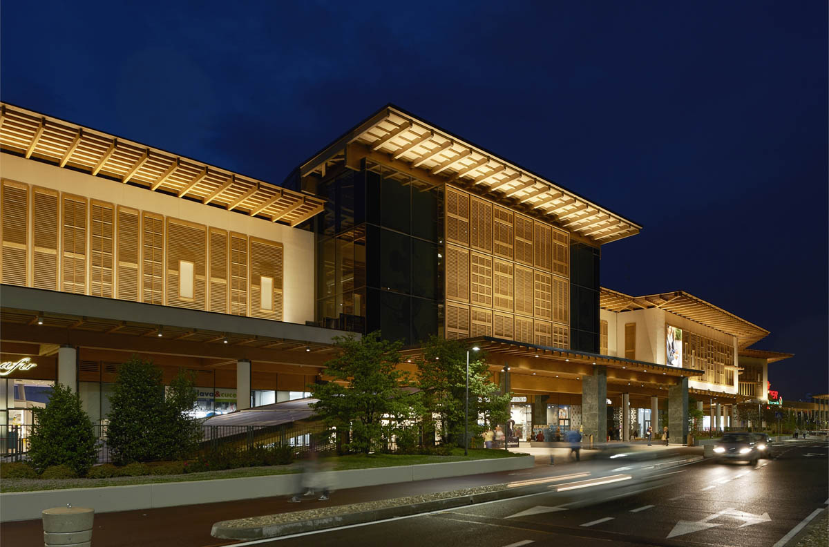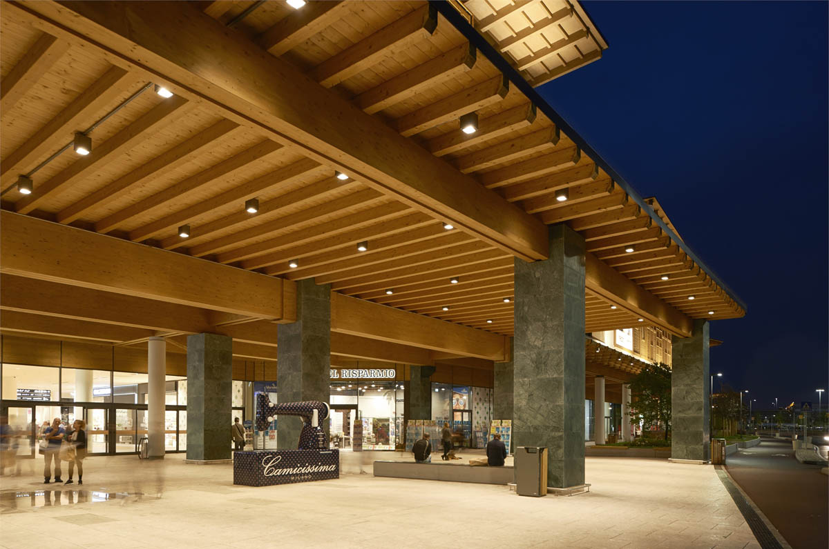 The entire complex has been designed according to the strict energy saving and bio-sustainability criteria required by the US Green Building Council standards for its much coveted LEED Gold certification. The lighting design has helped significant in achieving this goal, in that all the luminaires installed use LED lamps that boast average energy saving percentages of between 40% and 80% compared to the consumption of traditional lamps. The LED luminaires all feature DALI technology and are controlled by an IoT remote control system. Interior and exterior light sensors have also been installed to combine artificial and natural lighting. One particularly innovative feature is the technique used for the mall's roof design. For the first time ever a Glulam roof (a structural, laminated wood product made with sustainable materials) has been used for a shopping centre and it is one of the largest in Europe. Reflex recessed luminaires and 6000 lumen Front Lights with emergency units have been installed under the central wooden ceiling. The two luminaires guarantee soft, diffused general lighting, thanks partly to the height at which they have been fitted. Underscore devices have also been installed in the ceiling's criss-cross structure to create a number of striking graphic effects, and LED Pixel Plus recessed luminaires have been positioned along the edge of the walkway on the top floor to complement the general lighting in the individual brand stores. Outdoors, ceiling-mounted iPro floodlights have been used in the car park entrance areas, whereas pole-top versions have been used in the green areas. The wooden exterior facade is lit with grazing light created by a continuous line of Linealuce luminaires that have been alternated with iPro devices to make the final effect softer and less dramatic.