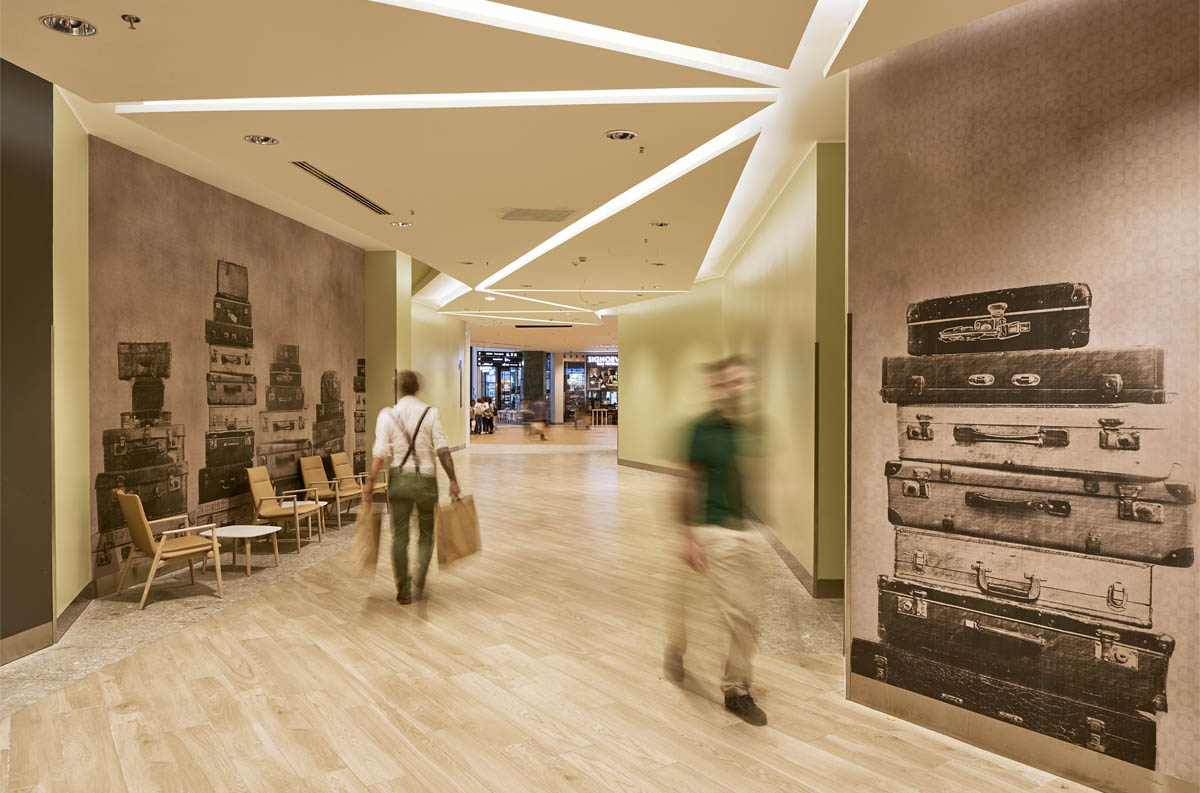Davide Padoa's studio, Design International created, the basic outline of the project, which is based on the format of large international malls but also offers a touch of history and an experience that suits the designs of De Lucchi, who has created the Fashion Court and Hypermarket. The Fashion Court, inspired by Covent Garden, is structured like a typical square with numerous shops facing onto it and a series of attractive meeting points. The architectural design stands out for the squares, each of which has its own distinctive style, and the wide, sculpted curve of the internal ramp that structures space in a way that is reminiscent of the Guggenheim Museum in New York. The hypermarket located in the Food Court has its own character too, especially its fresh produce area that offers visitors the opportunity to buy food products and consume them on the spot.