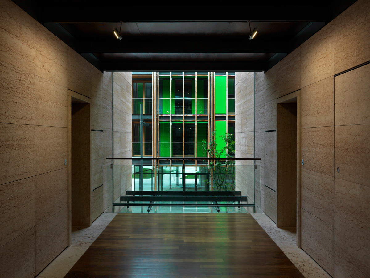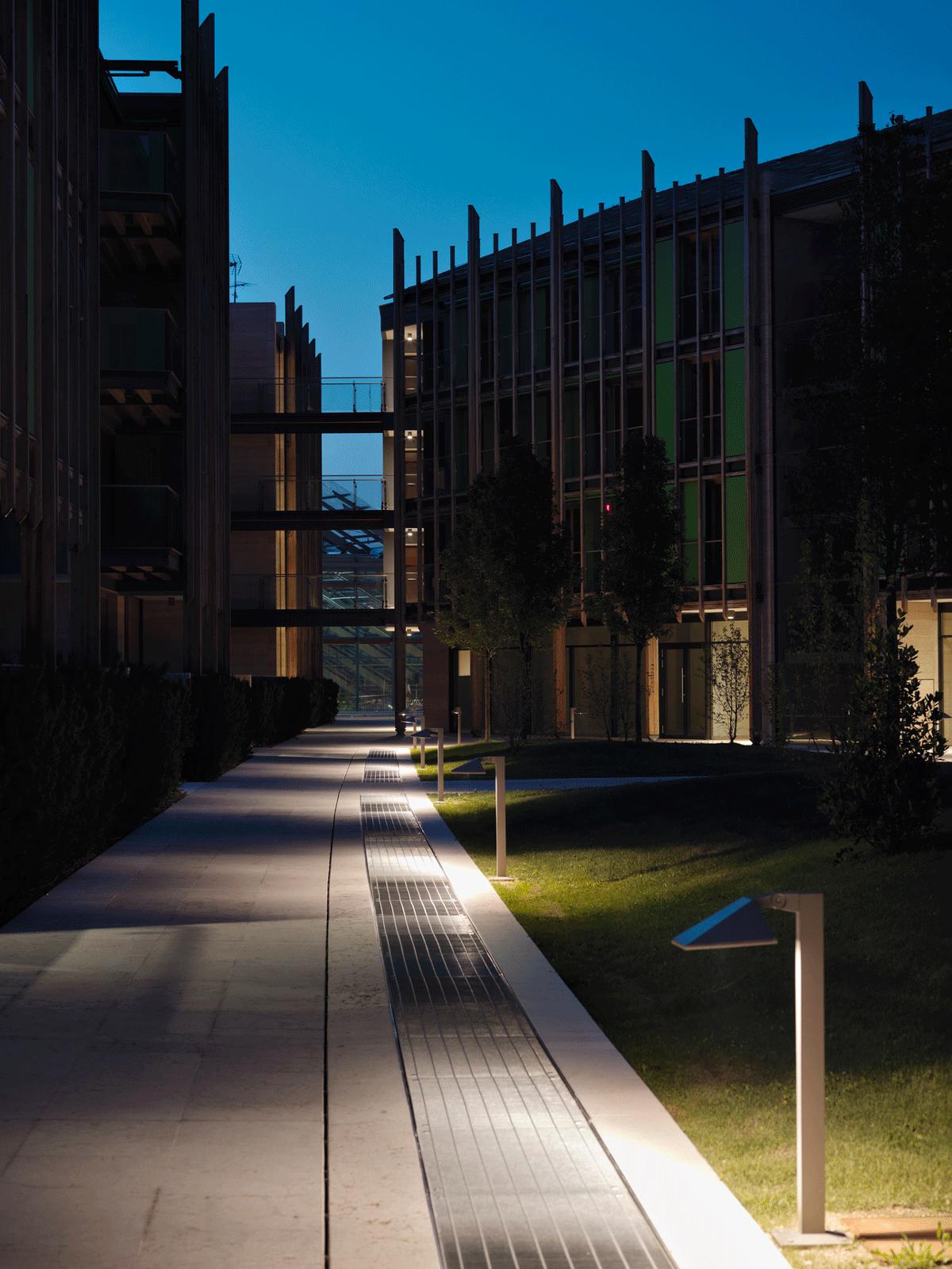 iPro, surface-mounted, medium body, 16W LED luminaires. This is a special, surface- mounted product with a glass diffuser screen, and it has been used particularly in high traffic areas, such as porticoes, to achieve diffused, even, non- invasive lighting as well as guaranteeing safety. The balconies on the residential buildings are also lit with surface-mounted, LED iPro luminaires, but with a small, 9W body, instead, and a Fresnel diffuser lens combined with a flood optic to create diffused lighting with a limited number of luminaires. Inside the residential complexes, the stairwells play an important role as, being made of glass, they help to create the rhythm and flow of the architecture that is reinforced by the green wall sections. The stairwells are indirectly lit by Primopiano 9W LED Wall Washer luminaires with a special fitting that allows them to be attached directly to the metal structure, while the driver is positioned remotely. The same luminaire is used on the top floors of the stairwells, but with a different, equally special connecting system, that fastens the device directly to the ceiling via an aluminium rod and base.