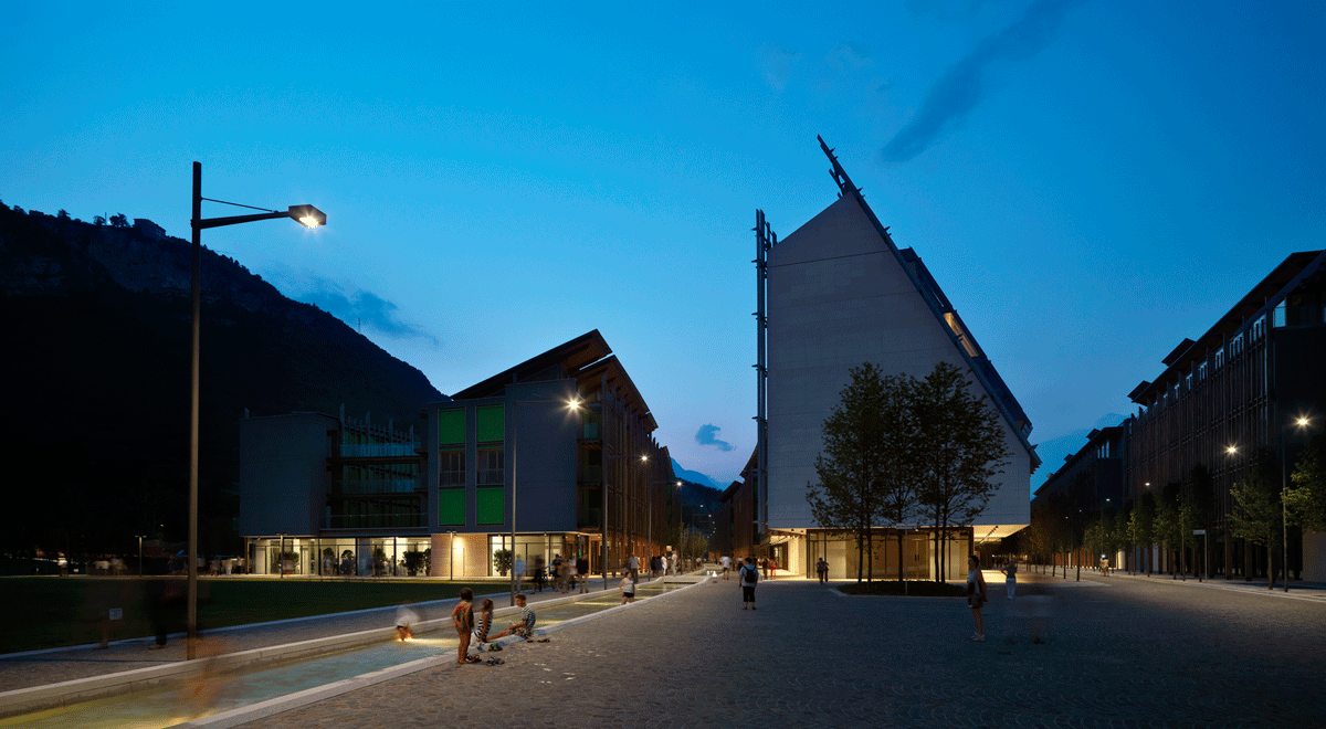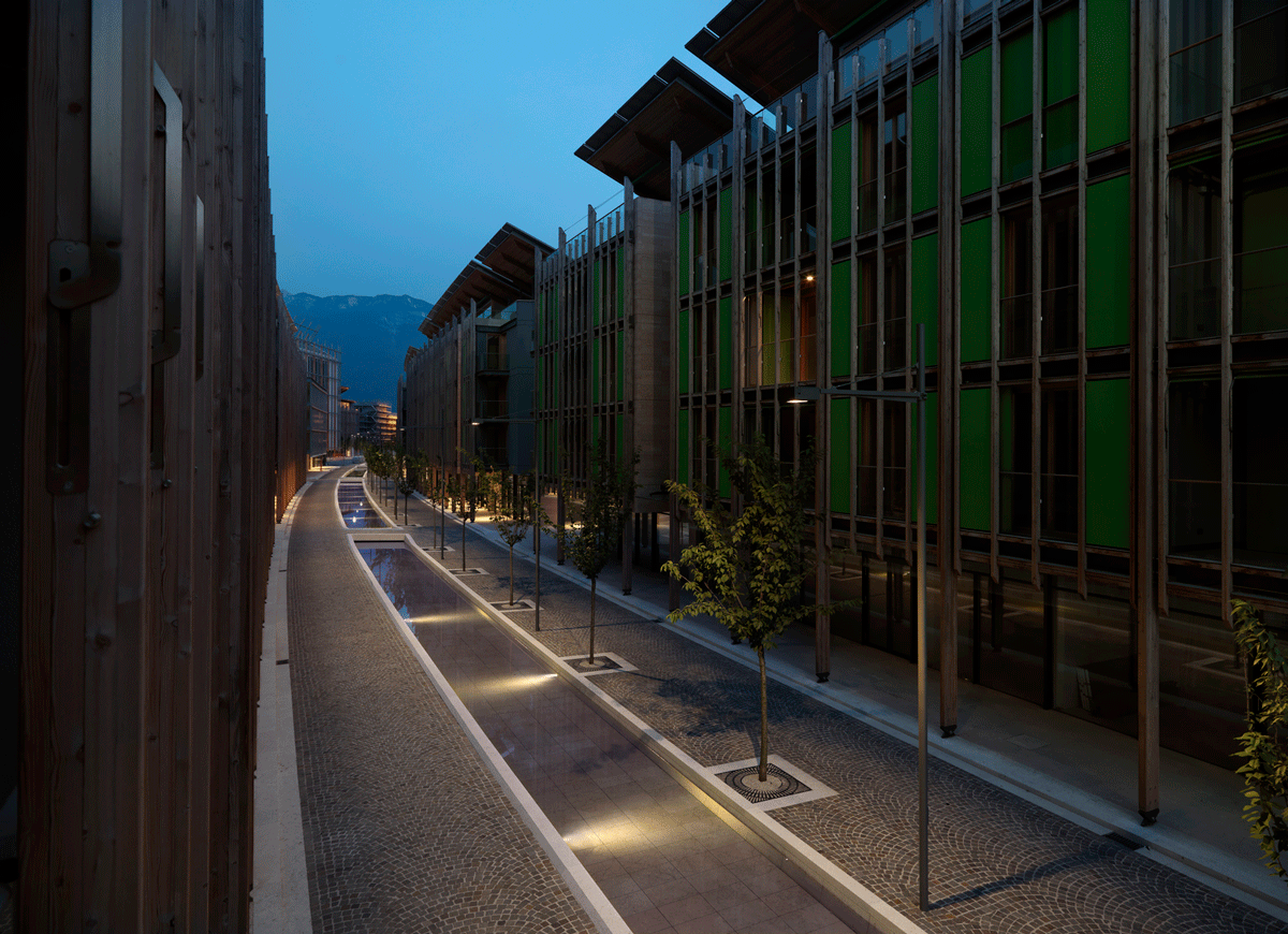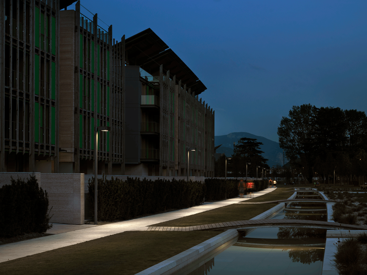 The new “Le Albere” district, designed by RPBW, stretches for an area of 11 hectares along the banks of the river Adige. It includes around 300 flats, 30,000 m² of office and shop space, squares, roads, pedestrian and cycle paths, as well as a network of canals, 5 hectares of public park, a multi-purpose centre and the MUSE Science Museum. The entire project has been designed to ensure environmental sustainability, environmental friendliness and energy savings. A trigeneration (combined cooling, heat and power) plant, specially developed for Dolomiti Energia, has been installed to supply the whole complex with hot and cold fluids. The residential and service industry buildings have a passive energy design with low energy consumption levels certified by CasaClima, while the museum and future conference centre are LEED Gold certified. Various areas in the district fall under iGuzzini and Renzo Piano’s partnered project to regenerate the former Michelin industrial zone in Trento. These include the museum, the office buildings, private homes and outdoor lighting in areas for both pedestrians and vehicular traffic.