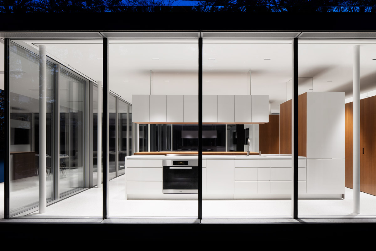 Despite its position, the pavilion is a far cry from traditional, rustic lakeside cabins. It is wrapped in glass walls that run from floor to ceiling and along the entire length of all four sides of the structure. This design immerses guests into a filter-free experience of nature. Natural light illuminates everything and the boundaries between forest and architecture are blurred. While tree branches, grassy slopes, and rippling waves become intrinsic elements of the structure, guests enjoy all the comforts of the interior: warmth, shelter, comfort, and relaxation.