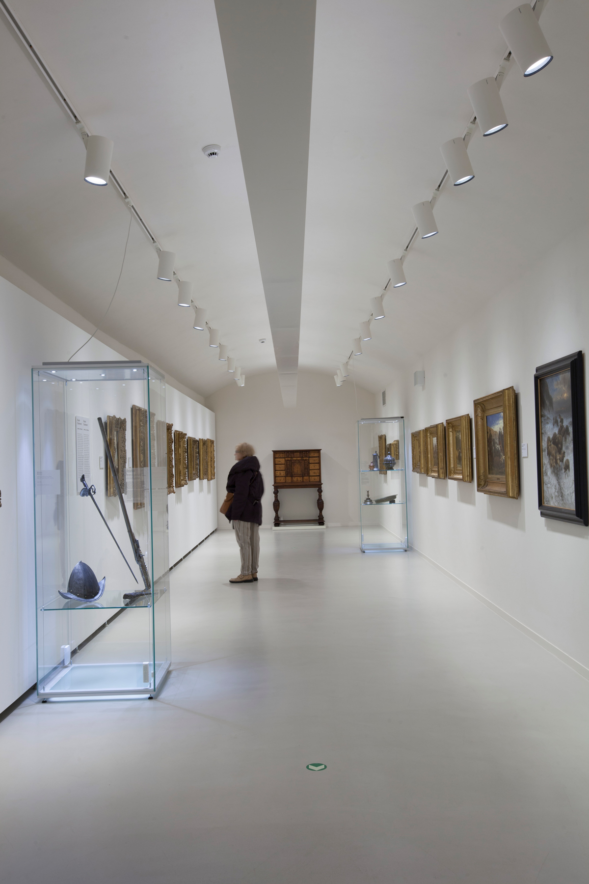 The direct lighting system, featuring Palco CRI90, 3000 K colour temperature, LED spotlights mounted on mains voltage tracks, also enhances both wall-hung or pedestal-displayed artworks.