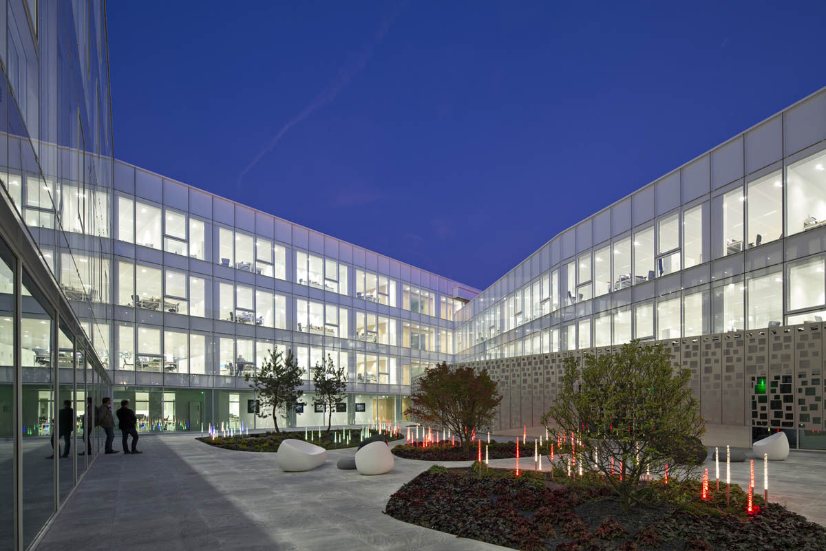 The building that houses the regional headquarters of the Atlantique Vendée, one of the major French banks, is a perfect example of bioclimactic architecture. Designed by the AIA Ingénierie studio, it features modular offices covering three floors surrounding a central plaza, as well as side platforms divided into five floors. The entrance features a 15m high glass frontage that allows natural light to pass through and includes a panoramic lift. In this context, the AIA architectural studio has decided to leave ample space for natural light while also carefully monitoring artificial light. The dynamic lighting concept in the hall and plaza are based on this principle and feature iGuzzini Zyl luminaires. To ensure that the building does not disappear at night or when the artificial lighting is switched off, the architects have created a central luminous animation that matches the vertical thrust of the large hall perfectly. The AIA studio lighting designer, Philippe Laheux, has chosen to use pendant glass luminaires in the large central hall. According to the lighting designer, using LED lighting was a must as this technology reduces consumption and allows control systems to be used that can create dynamic lighting and command colour and intensity variations automatically.