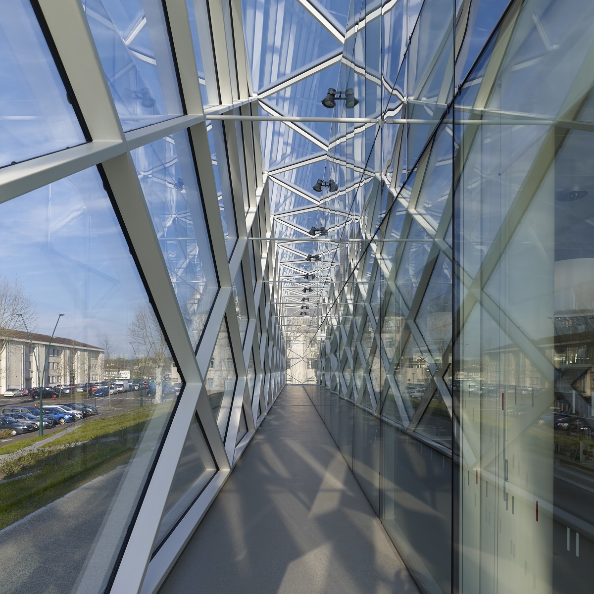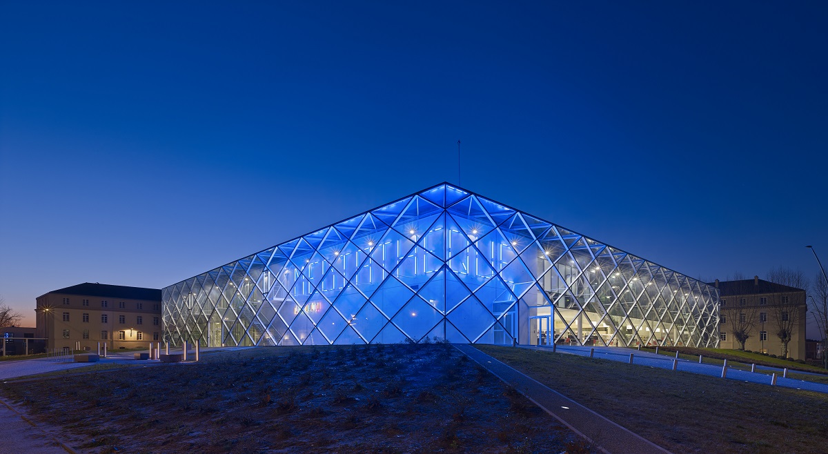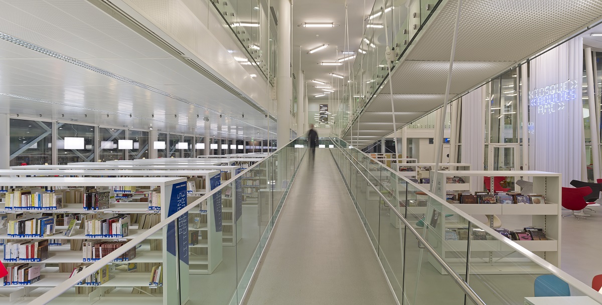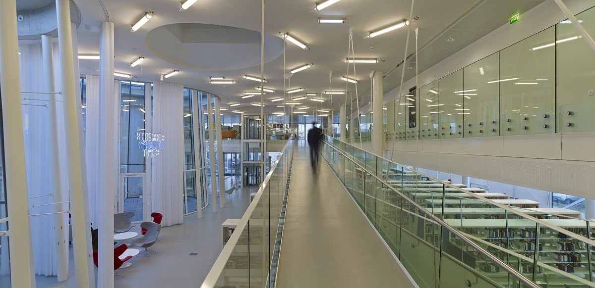 Pencil bollards and glass Ledplus groundrecessed luminaires light the zone around the media library, whilst the inside of the double skin is enhanced by MaxiWoody floodlights with metal halide lamps. Inside, around a hundred iSign luminaires are graphically arranged on the ceiling and some Tray pendant luminaires alternate above the reading and working areas. As well as its cultural mission, the Media library is a place for relaxation, information, social integration, educational support and document preservation. Exhibitions, conferences, workshops, film showings are held all year round, making it an essential place for city life.