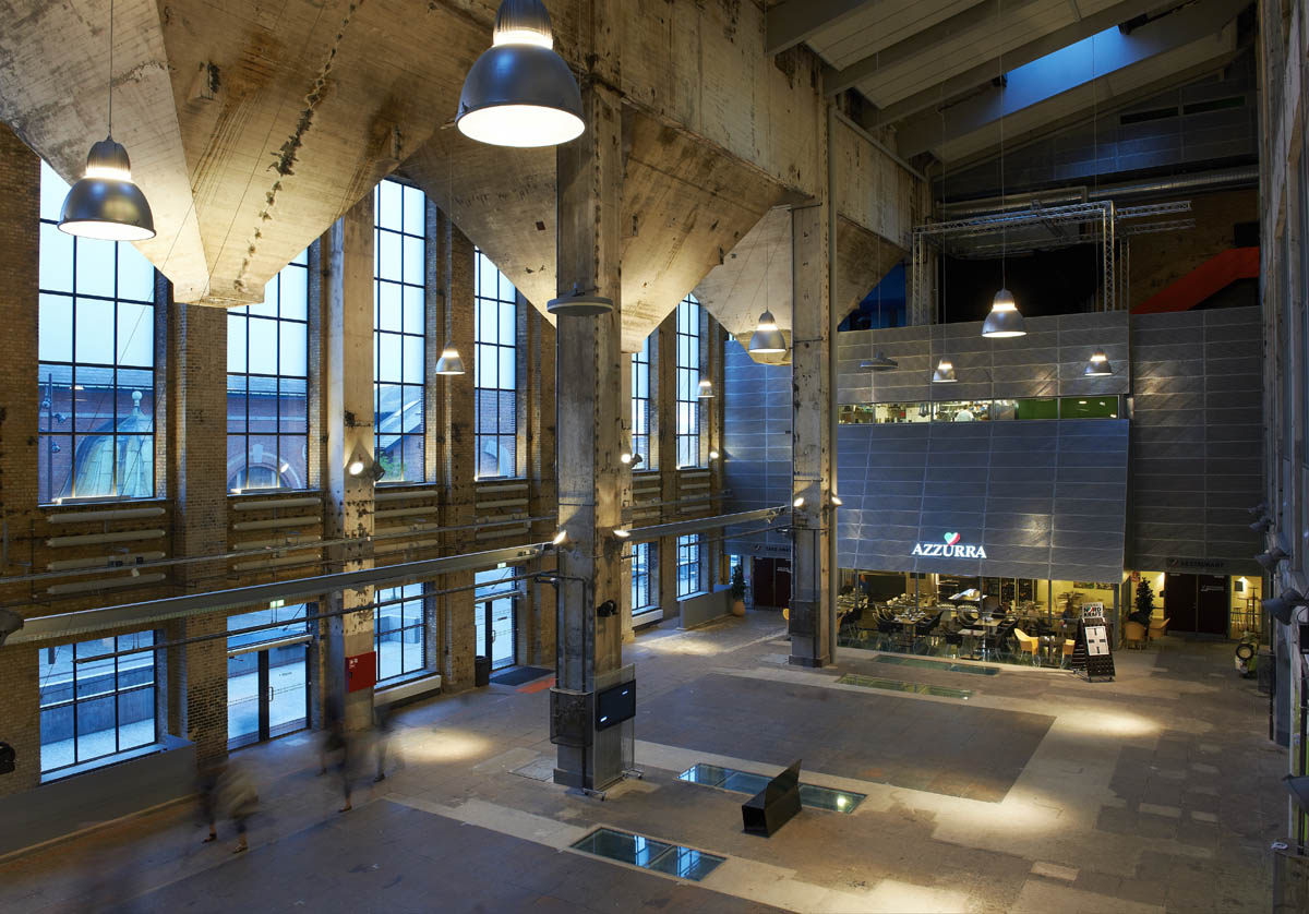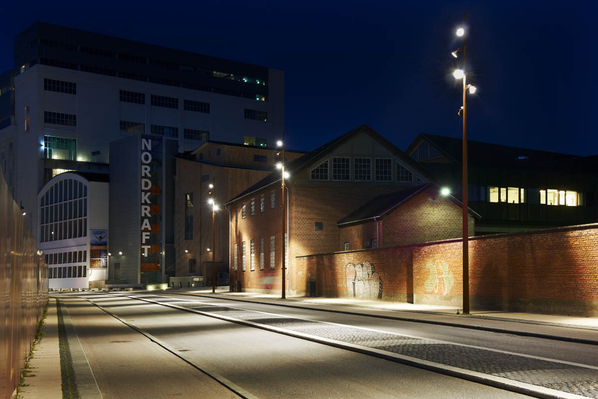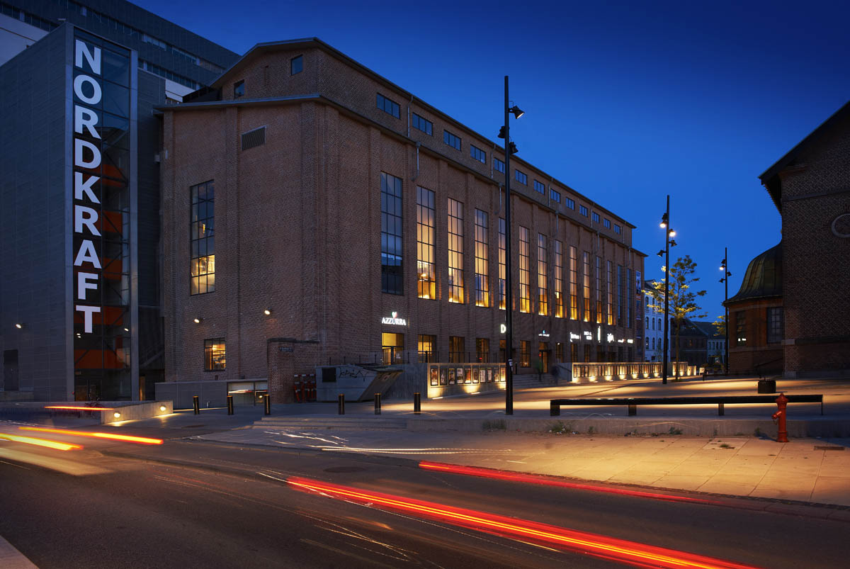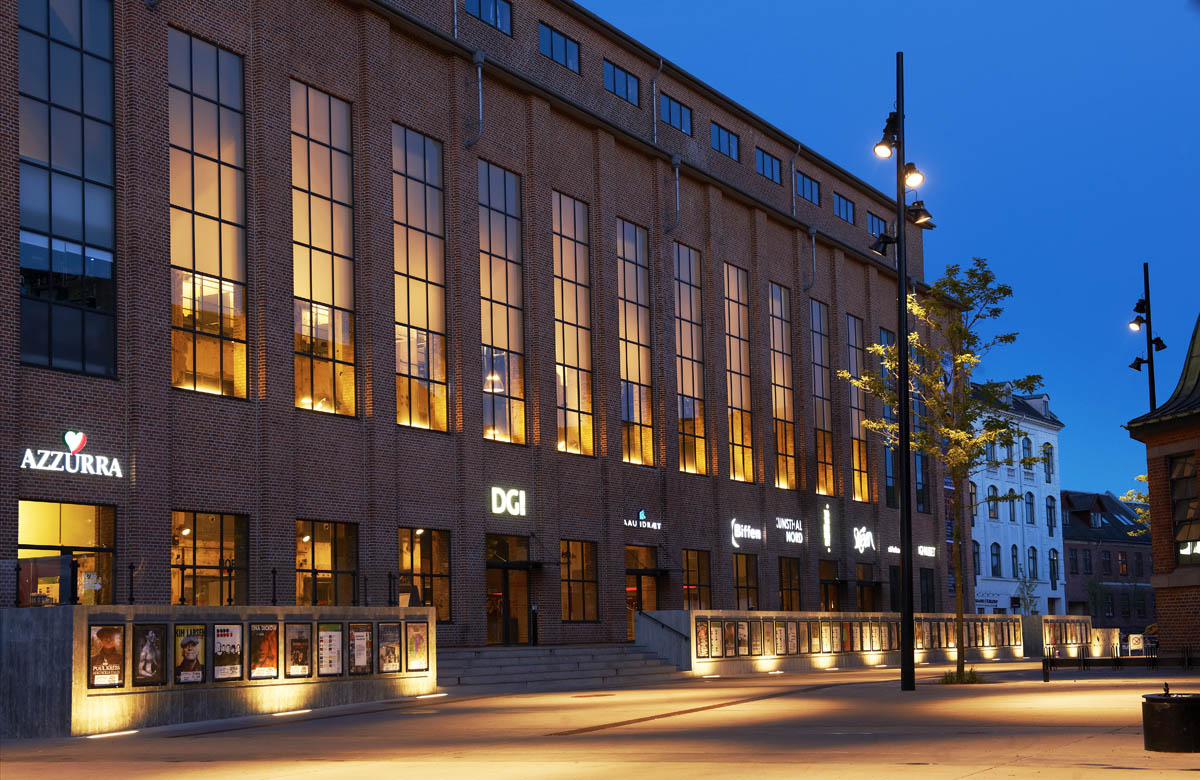 In 2004, Aalborg City Council bought the old Elsam electricity plant with the intention of creating “Nordkraft”, a centre for culture, sports, leisure and more. The old electricity generating plant has become a place which focuses on music, teaching, theatre and art, and the old concrete structures have been preserved. The project was awarded to Cubo Architects A/S together with Brix & Kamp AS, Korsbæk & partnere AS, Arkitektfirmaet Nord and Egebjerg By og Landskab. The idea was to maintain the original rough, industrial look, combining it with optimum solutions for culture and leisure activities. This “industrial” effect was also sought for the lighting and the luminaires selected were Maxiwoody spotlights and Berlino pendant luminaires. The Berlino was chosen for its dimensions and the possibility of using different lamps. Both the large version with direct/indirect lighting and the small glass version were used. Berlino luminaires are installed at the entrance, in the connecting areas and at reception. The Maxiwoody spotlights light the outer square and highlight some interior features of the building. Maxiwoody luminaires were used inside and pole-mounted outside to try to establish a link between the interiors and the urban setting. Wallmounted Linealuce luminaires light the cinema posters, while Ledplus luminaires line the cinema steps. Nordkraft is located close to the port district where a new area was developed. It has become one of the features of the skyline there and represents a link between the industrial architecture and the silos in that zone. Nordkraft is one of the largest buildings in the area, with a surface area of 30,250 square metres.