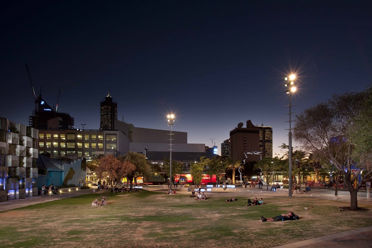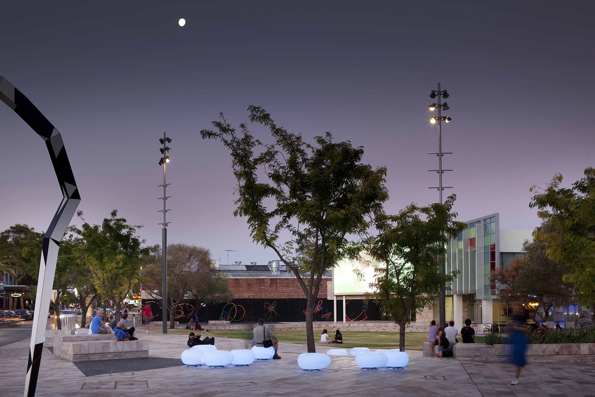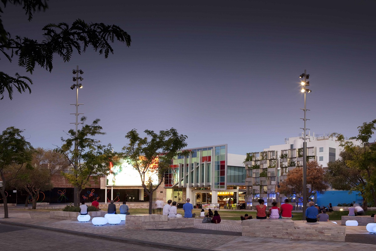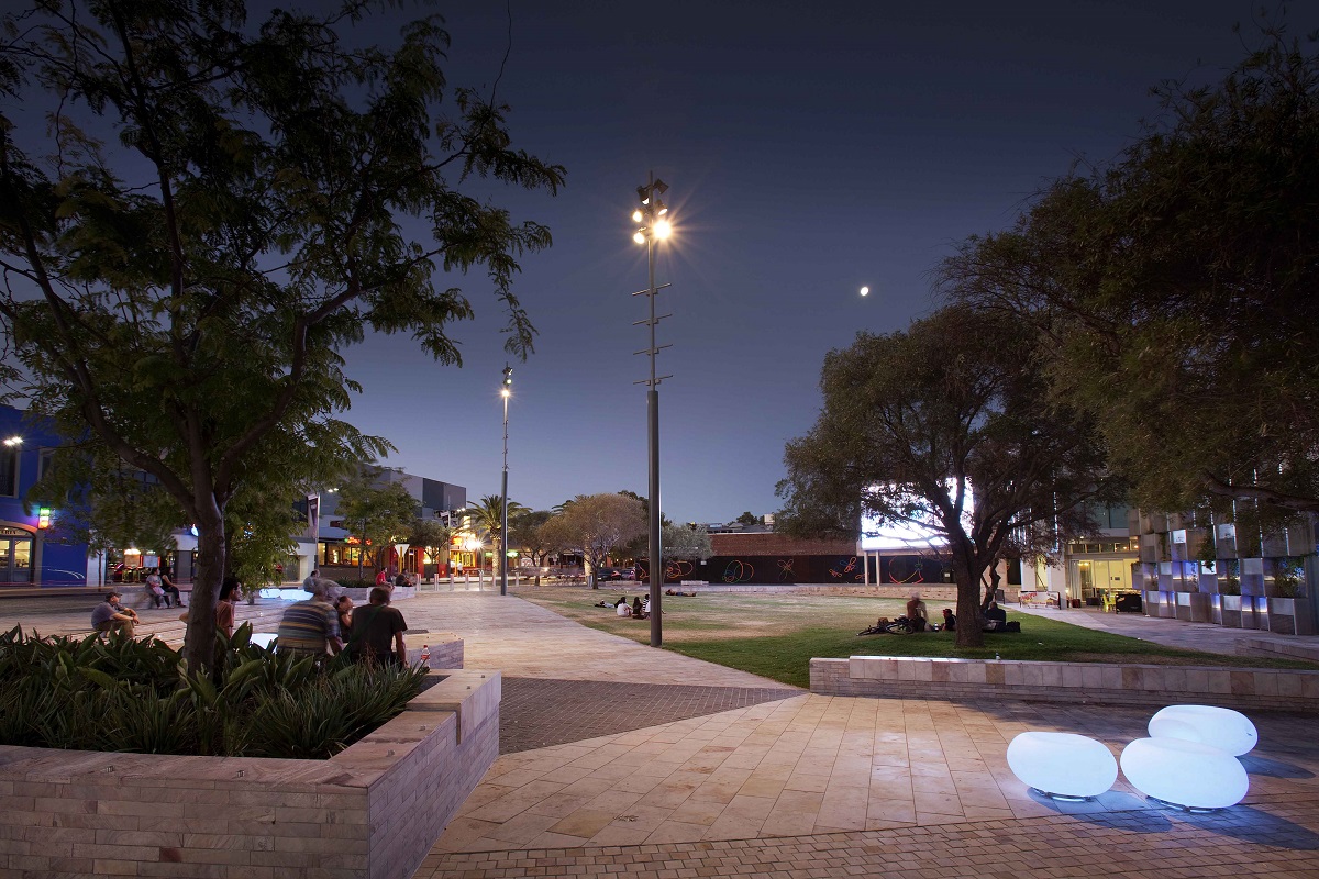 The lighting design, by WSP Lincolne Scott is linked to the sense of safety and relaxation that the zone was required to offer. Mondoluce provided the technical support needed to identify the best product for creating a welcoming atmosphere. Woody floodlights were installed on poles to light the grassy area at the centre of the piazza, giving a suitable and comfortable urban lighting level for the Piazza and its visitors.