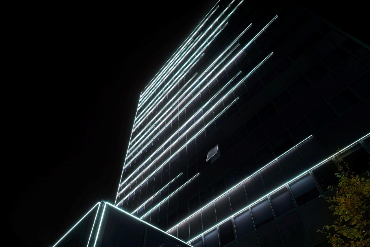 The use of Underscore InOut Top Bend 16 mm overcame the installation challenges through its very minimal profiles. These were painted with a special colour so that they could blend with the steel structure of the towers and completely camouflage the fittings during the day. This solution tested the flexibility and conceptual limits of the Underscore InOut luminaire, allowing to create the architect’s vision and to provide an outline that emphasises the structure of the building without trivialising it. Moreover, during the night, the lighting effect lends architectural identity to a construction that, during the day, has no distinctive features. The lines of various lengths that run horizontally across the four towers of the complex, highlight the main corners and enhance the views on Corso Giulio Cesare, the main entrance into Turin from the north east.