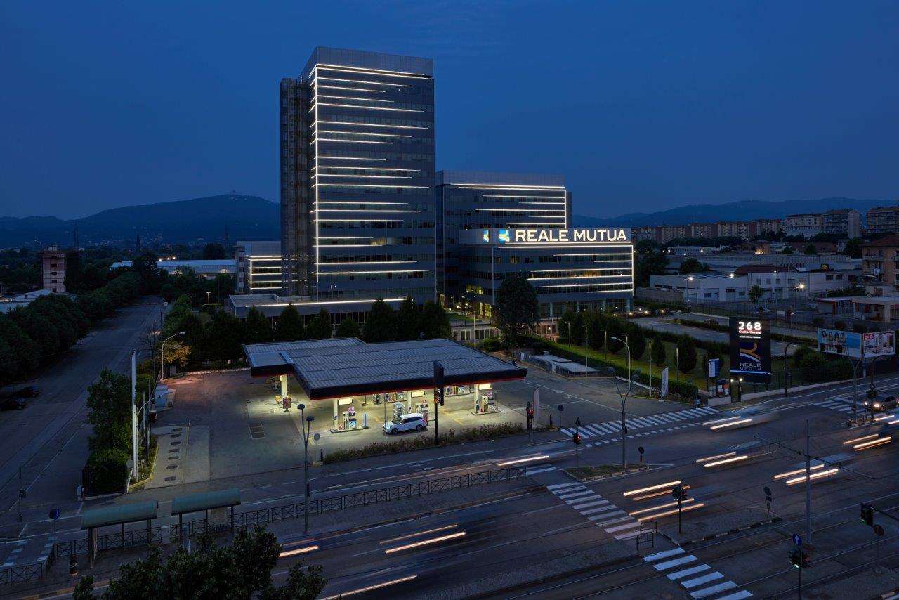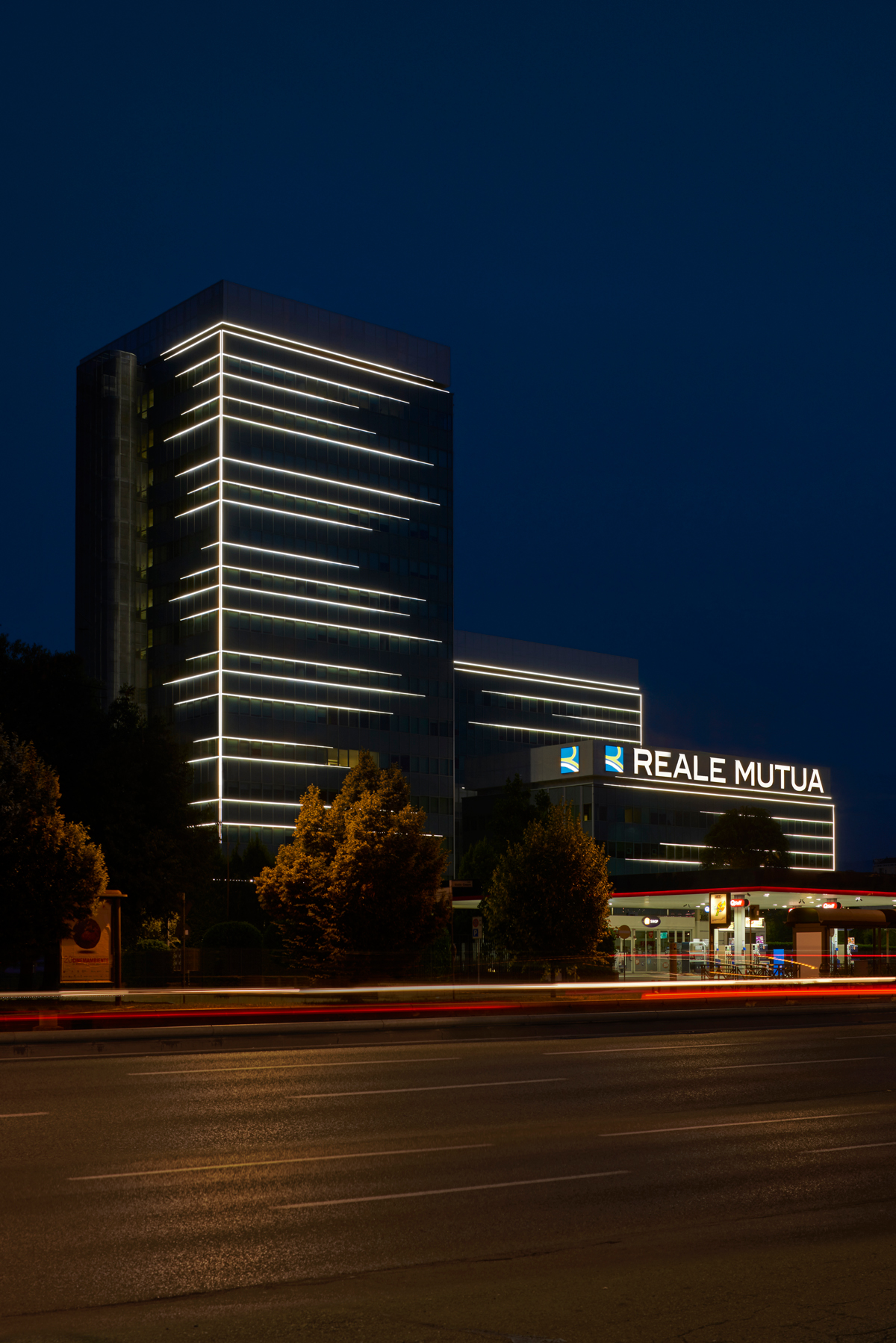 The Reale Mutua office complex was built between 2003 and 2006 and consists of four buildings of fourteen, eight, four and three storeys, respectively, intended for office and retail use. The structures feature continuous aluminium and glass façades. Their linearity and uniformity – in other words, the complete lack of architectural grips – rendered the design and implementation of the lighting effects particularly time consuming owing to challenges encountered during the installation of the lighting equipment. In 2016 the Underscore InOut luminaire allowed us to resolve these issues and create unique lighting effects for the buildings. One and a half kilometres of Underscore InOut were used to create lines of light that emphasize the buildings’ different heights and generate gradually fading horizontal lines. This effect was achieved by progressively dimming four sections of the Underscore InOut installation. The four sections differed in length in order to prevent each stroke of light from ending too abruptly. The final result looks like a pencil of light outlining a sort of sfumato effect which reverses light with shadows.
