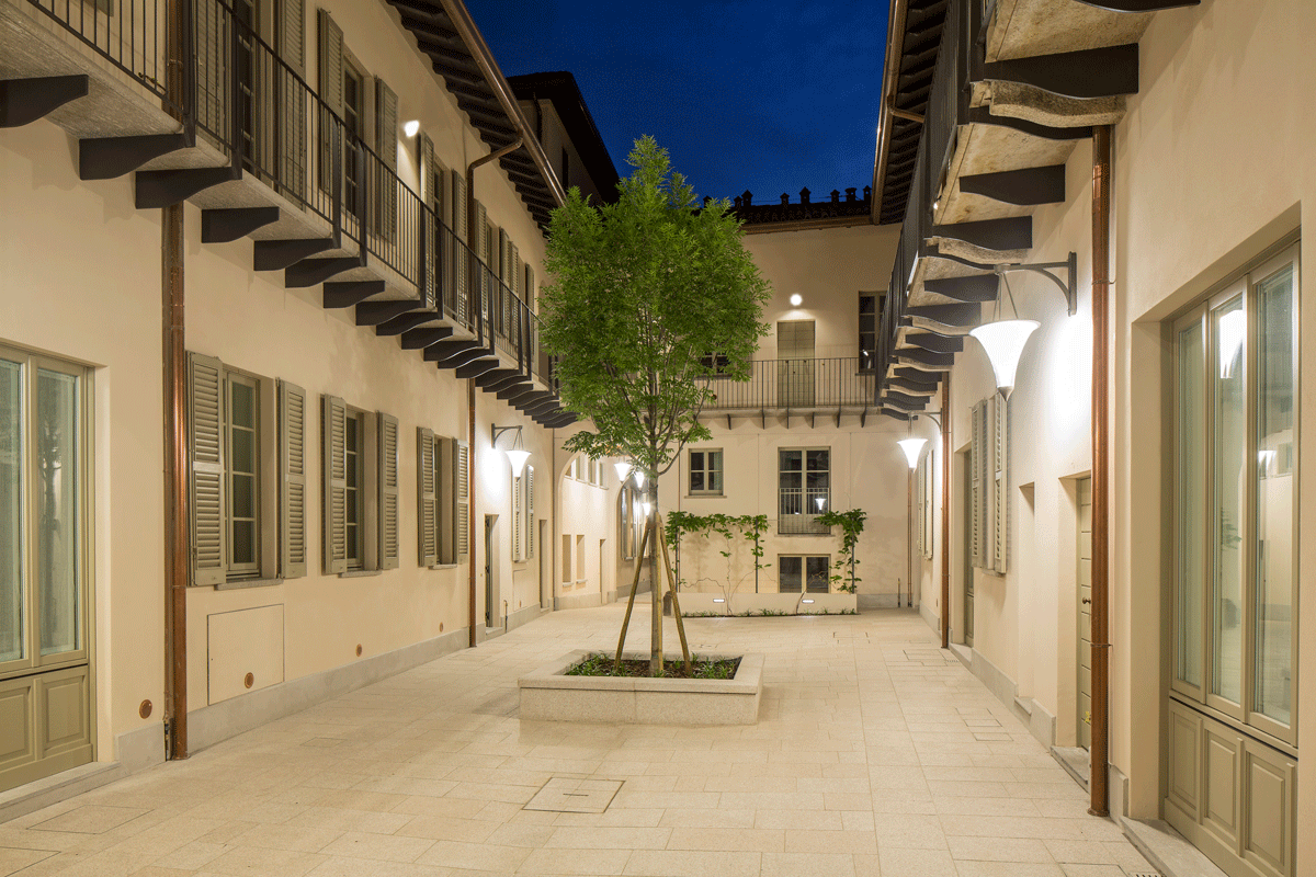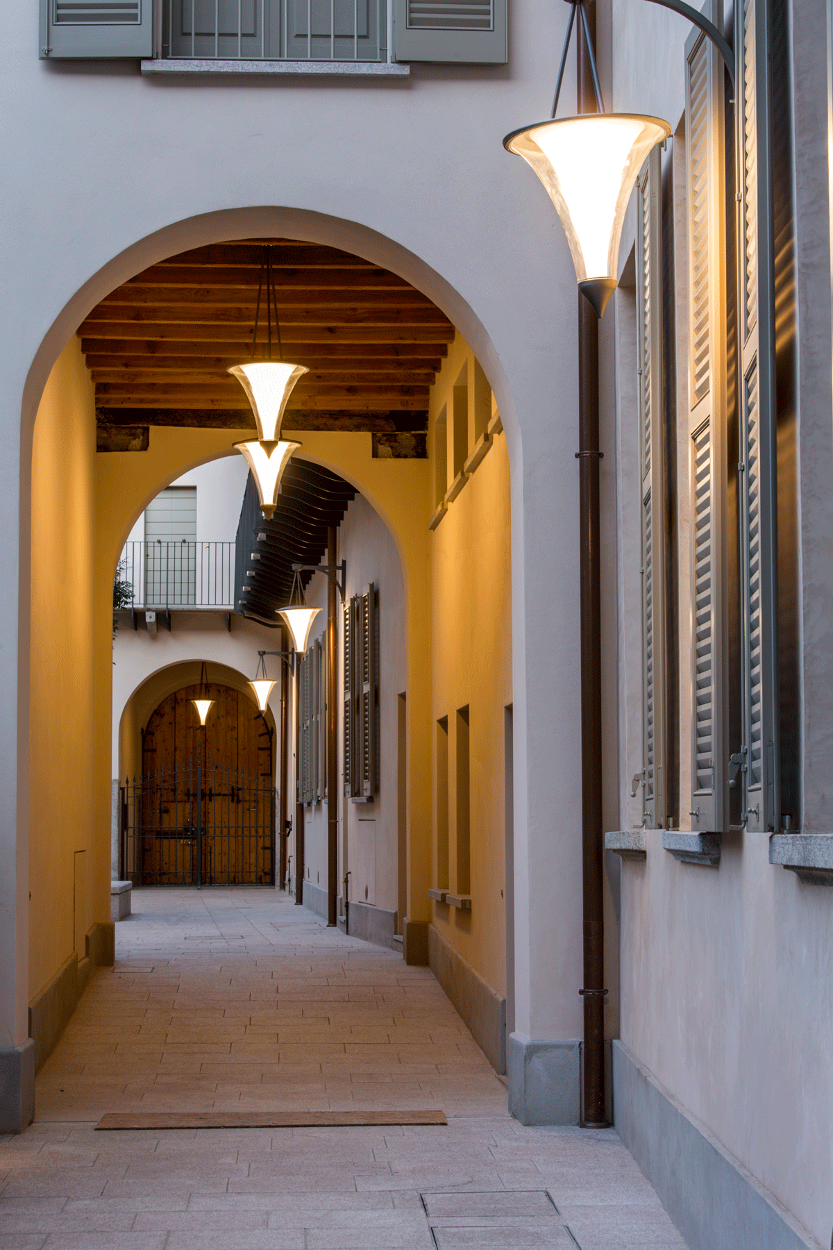 Fiamma, are carefully integrated with the architectural features so as not to disturb the historic style of the environments. These special lanterns are made of two polycarbonate shells, which encapsulate an LED lamp with a transformer housed in the pole top or base. When located in the courtyards they illuminate exterior shared and transit space, whereas a pendant version with a special dish shape is used on stairs and balconies.