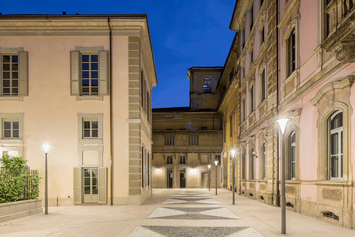 The building's interiors include a forked staircase that is based on the much larger one in Palazzo Litta, the family's other home in Corso Magenta. There is also a passageway and a chapel with frescoes and stucco-work by Giocondo Albertolli, Andrea Appiani and Giuseppe Crivelli. The public and private exteriors and the interiors are lit with luminaires specially designed for this project by iGuzzini and the architect, Michele De Lucchi. These include a family of pole-top, ceiling and pendant mounted luminaires that blend with the timeless character of the old Milan style of the lobbies, landings and porter's lodges, but also feature highly advanced technology in terms of energy saving and light quality. The luminaires,