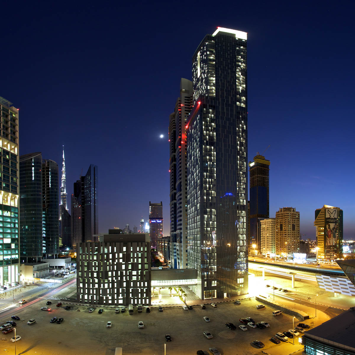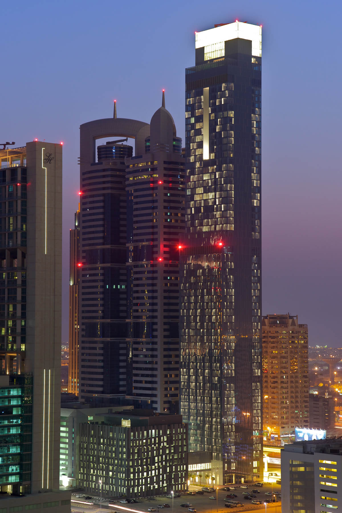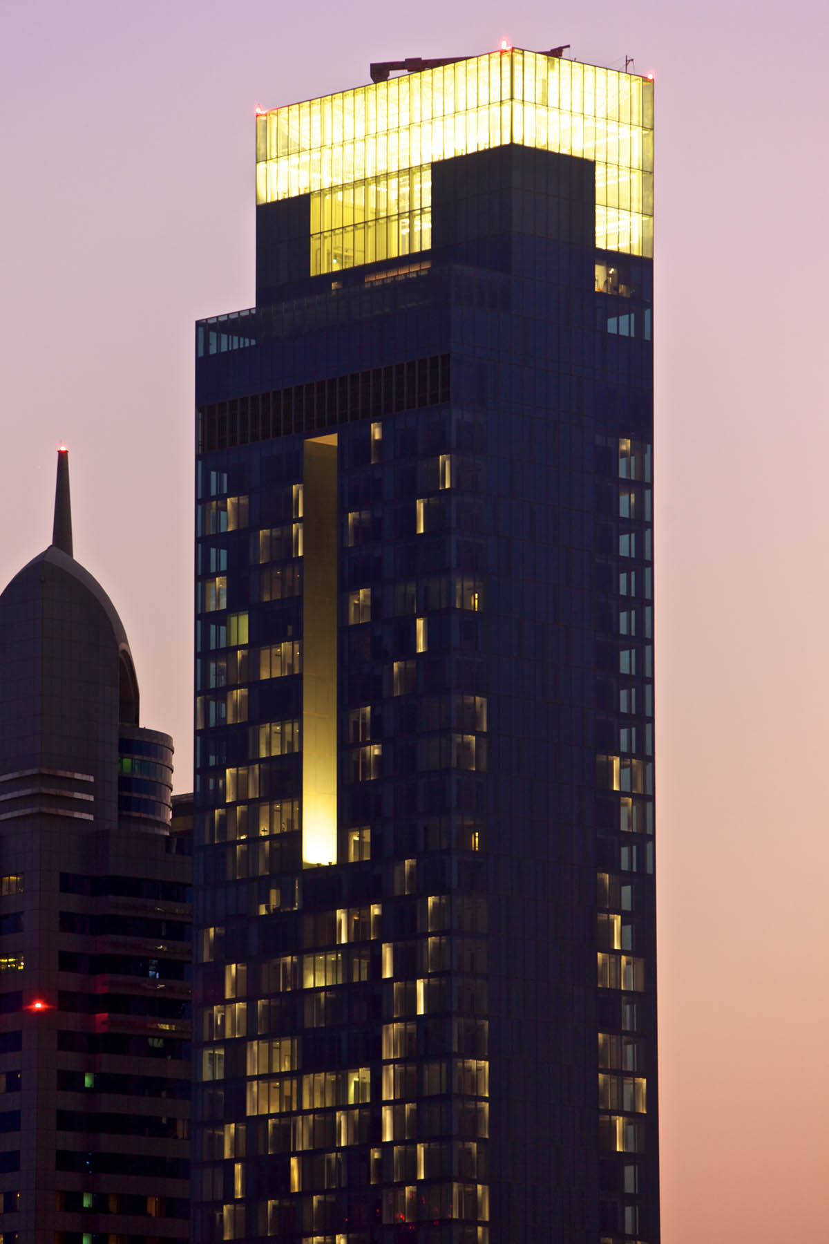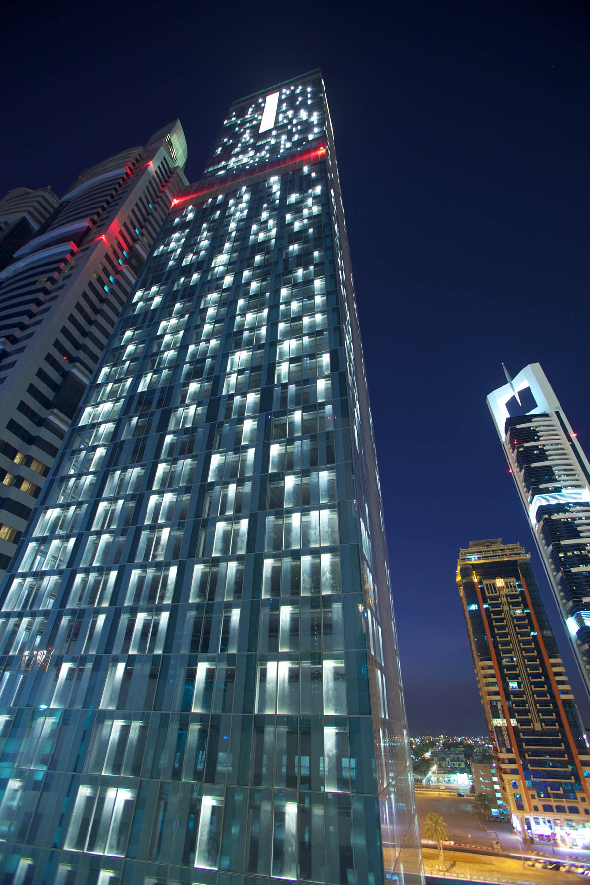 The first Rolex Tower in the Middle East was unveiled in Dubai, in the presence of numerous guests and journalists. The complex, with a spectacular glass facade reflecting the city’s countless lights, was designed by architectural firm Skidmore, Owings and Merrill. The Dubai tower has 25 storeys of flats, including two penthouses, as well as 31 storeys of commercial spaces. The extremely simple parallelepiped shape seems to be covered with a veil thanks to the use of glass with a milky effect. In contrast, the upper part of the building loses its opaqueness, turning transparent with an effect similar to that of the pixels of digital images. The architects and the Lighting designer wanted to recreate the same type of pixelated effect at night.
