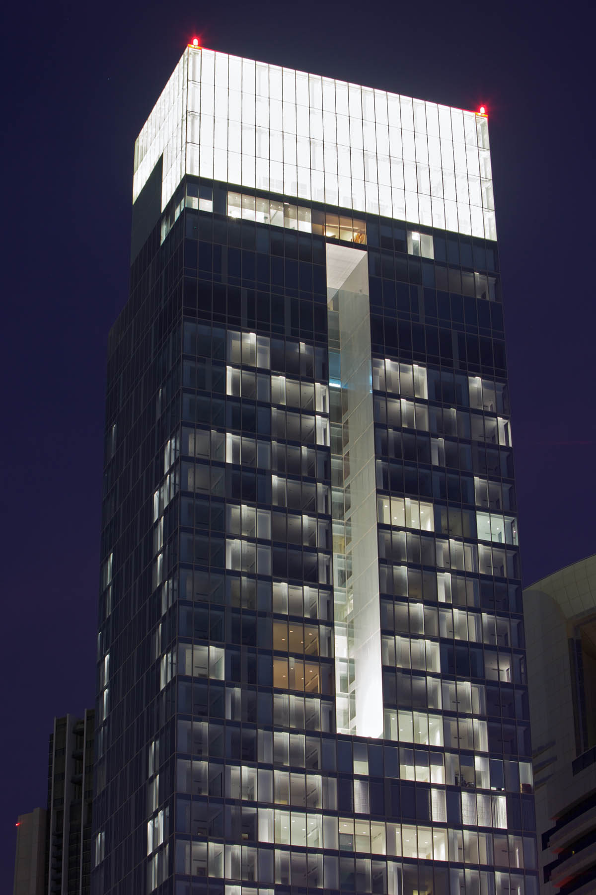 Therefore since the building was first lit up in February 2010, 800 special LED luminaires with a diversified switch, have been managed by a control system (storey by storey) set up by iGuzzini. The control system has been recreating the tower’s daytime milky effect which gradually turns more and more transparent the further upwards it goes. The night-time appearance also includes more intense lighting at the top of the building, with a kind of torch effect, as if the building were crowned to resemble the Rolex logo. The final lighting was achieved after a process in which three different iGuzzini branches each developed a part of the complex project.