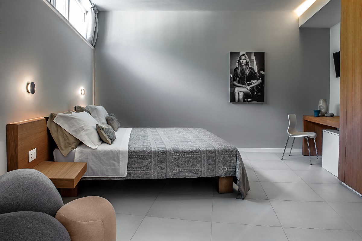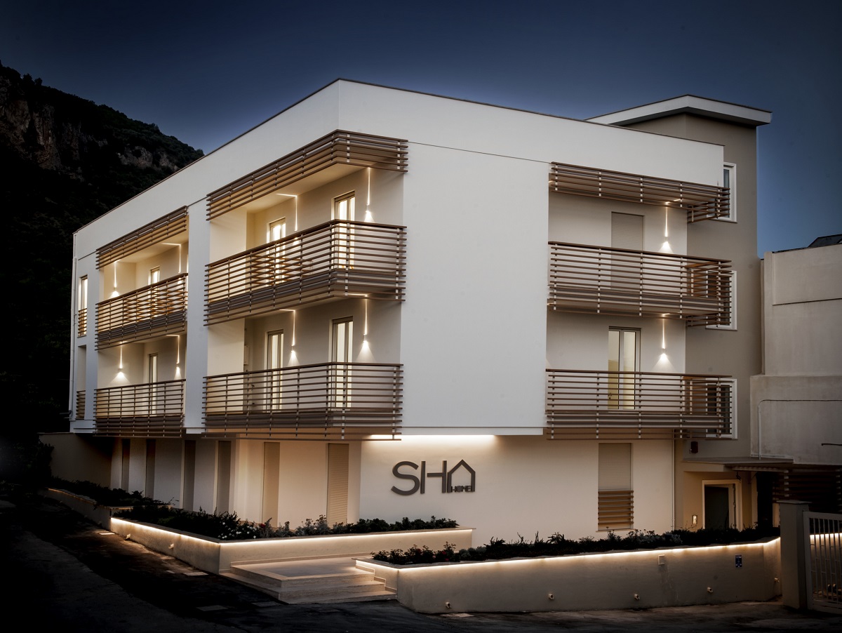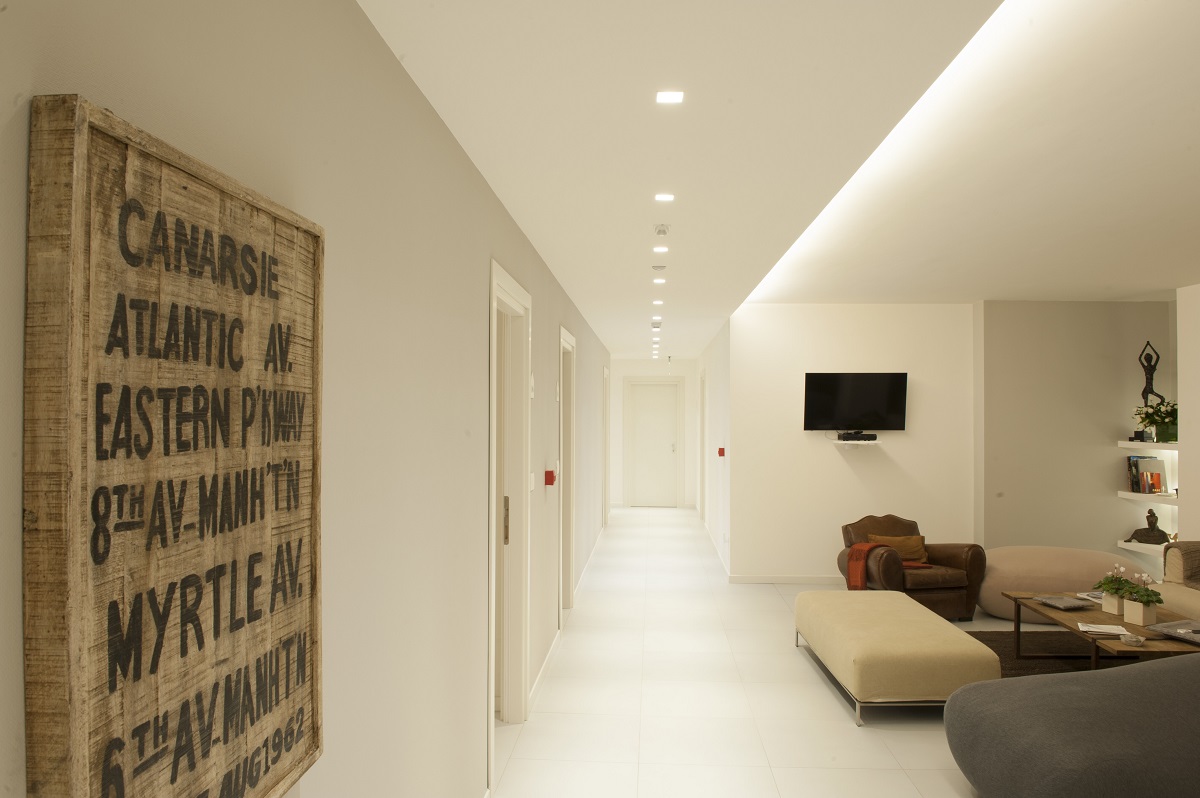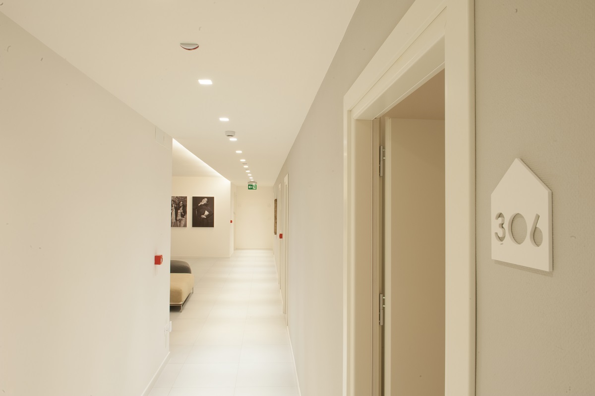 A factory building, originally constructed in the 1990s, in the industrial area of Palma Campania near Naples, has recently been transformed into a residential structure. This is the SH Home "room & breakfast" residence that takes its name from the initials of the fashion brand Silvian Heach. The building's regeneration consists of three floors above ground ad one floor below it, and its facades and interiors have been completely renovated. The two main elevations are punctuated by horizontal lines created by series of wooden strips that form parapets, brise-soleils and partitions between the rooms. These lines intersect with the directrices of vertical light created by the iPro Micro up&down luminaires positioned at the sides of the bedroom glass doors. The "room & breakfast" structure is located on the third floor of the building. A communal area leads onto the bedrooms and this is lit by a combination of natural light that floods in through a skylight and recessed Deep Minimal spotlights. The bedrooms offer every comfort and service. Ambient lighting is provided by Ledstrips hidden in grooves in the walls whereas two wall-mounted Trick luminaires act as bedside reading lights that also highlight the jute cloth coverings thanks to their grazing beam effect. The rooms have a number of other distinctive elements, such as blow-up shots from the brand's famous advertising campaigns, taken by prestigious photographers such as Terry Richardson, David Burton and Giampaolo Sgura. The overall idea is to create a fashion gallery featuring all the unconventional images that have distinguished the Silvian Heach brand. The various entrances to the building seem to float in space as they are lit by Ledstrips hidden under the flower boxes. The lighting system, designed by the STUDIO Architetti Associati Granagnello Caliendo plays a major role in making this building a gem of architecture and design.