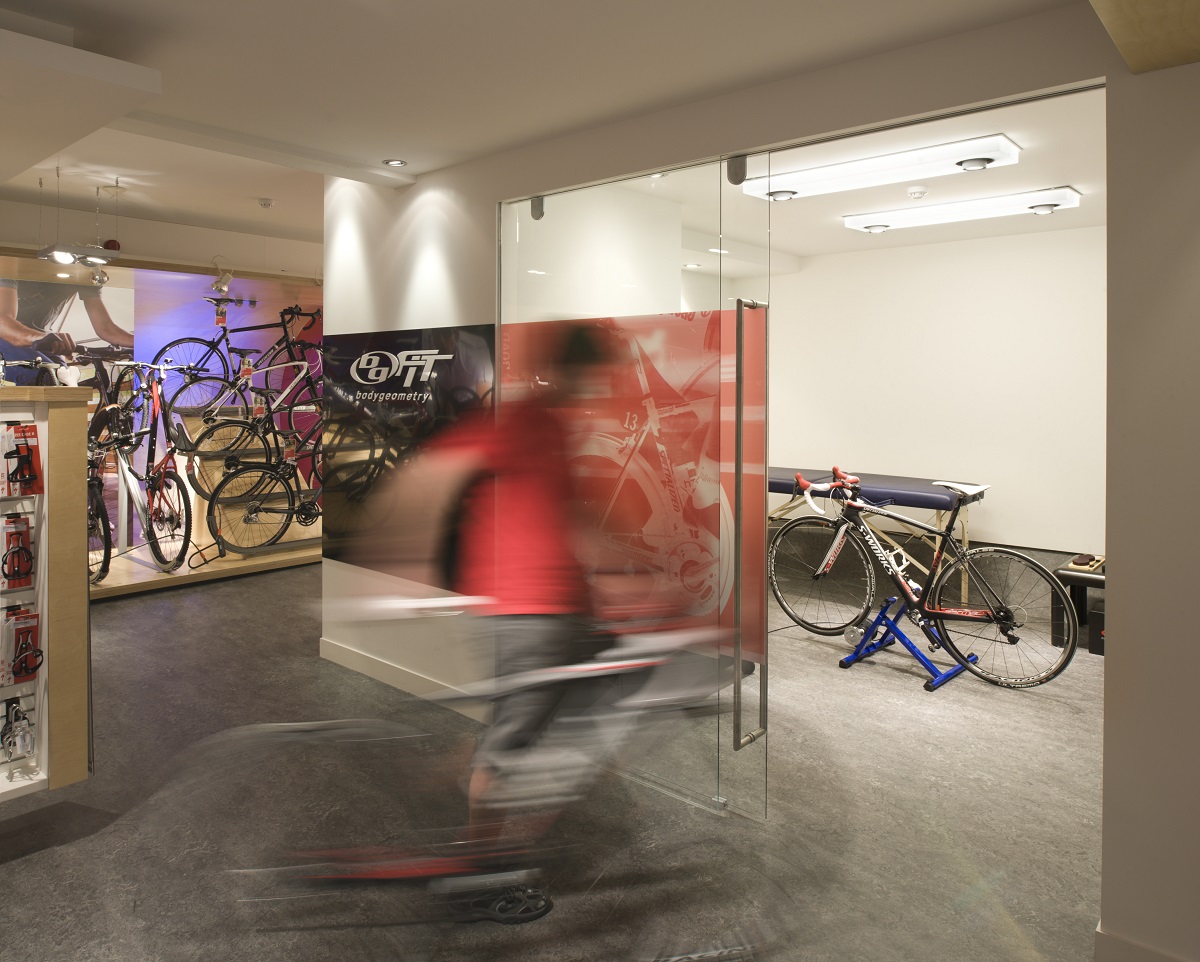 Mixto fitting, offering the perfect blend between workable ambient light levels and retail contrast. This room really works to symbolise the professionalism of the retailer and focus the customer needs when creating the perfect bespoke bicycle.
