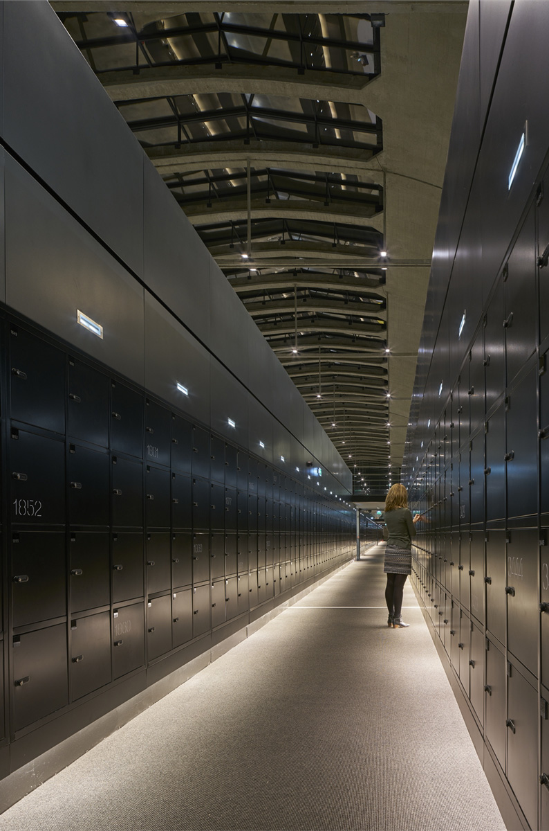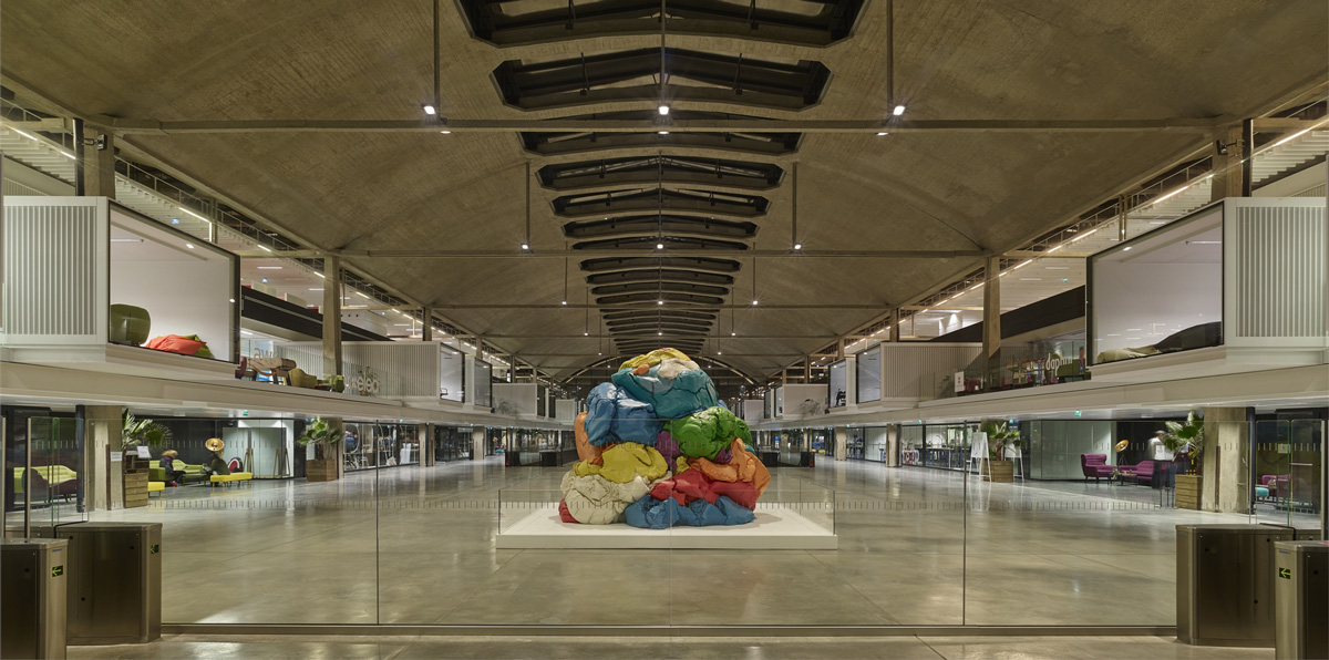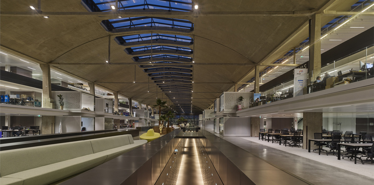 The building basically consists of a main central space under a vast barrel vault with a large skylight in the middle of it, and a series of individual startup boxes, created from iron structures, which run down either side and are completely separate from the original concrete walls. The small rooms located on the ground and first floor have glass fronts overlooking the shared central space, while the top floor hosts a series of cantilevered container boxes that recall the depot’s original purpose. The building includes a “Share Area - a large open space for meeting and sharing skills and digital technologies - is located, as well as a “Fab Lab” that is equipped with freely accessible 3D printers and a 370-seat auditorium.