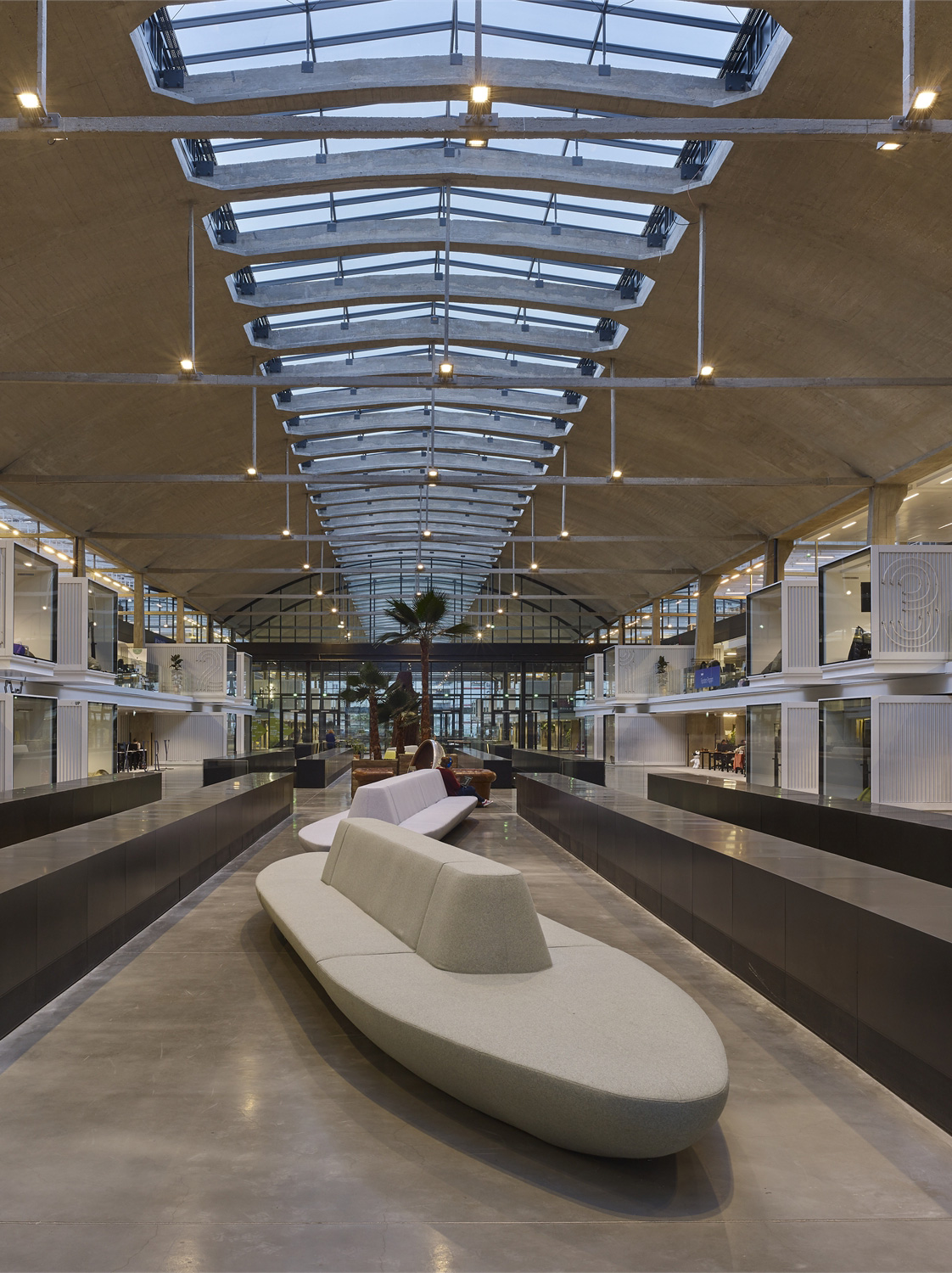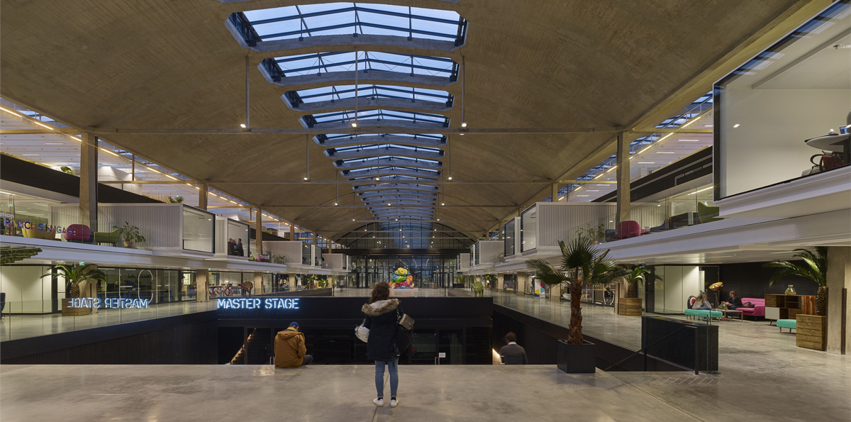 310 metres long and 58 metres away, Station F consists of three parallel naves with slim pre-compressed concrete arches, each of which has a specific function. The refurbishment plan designed by the Wilmotte & Associés studio is simple and effective. It eliminates any superfluous decoration to reveal the elegance of the structure and enhance the refined proportions of the main and secondary pre-compressed reinforced concrete elements. The new window frames that complete the building are made of flat iron and create a comfortable environment while also matching the structure’s original style.