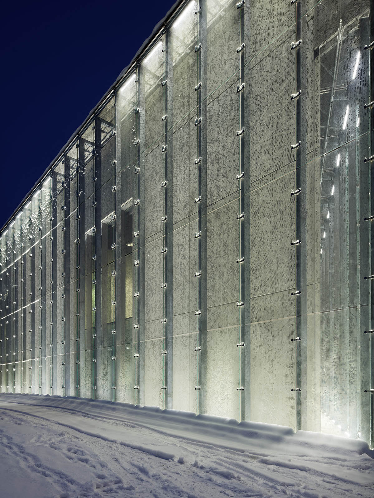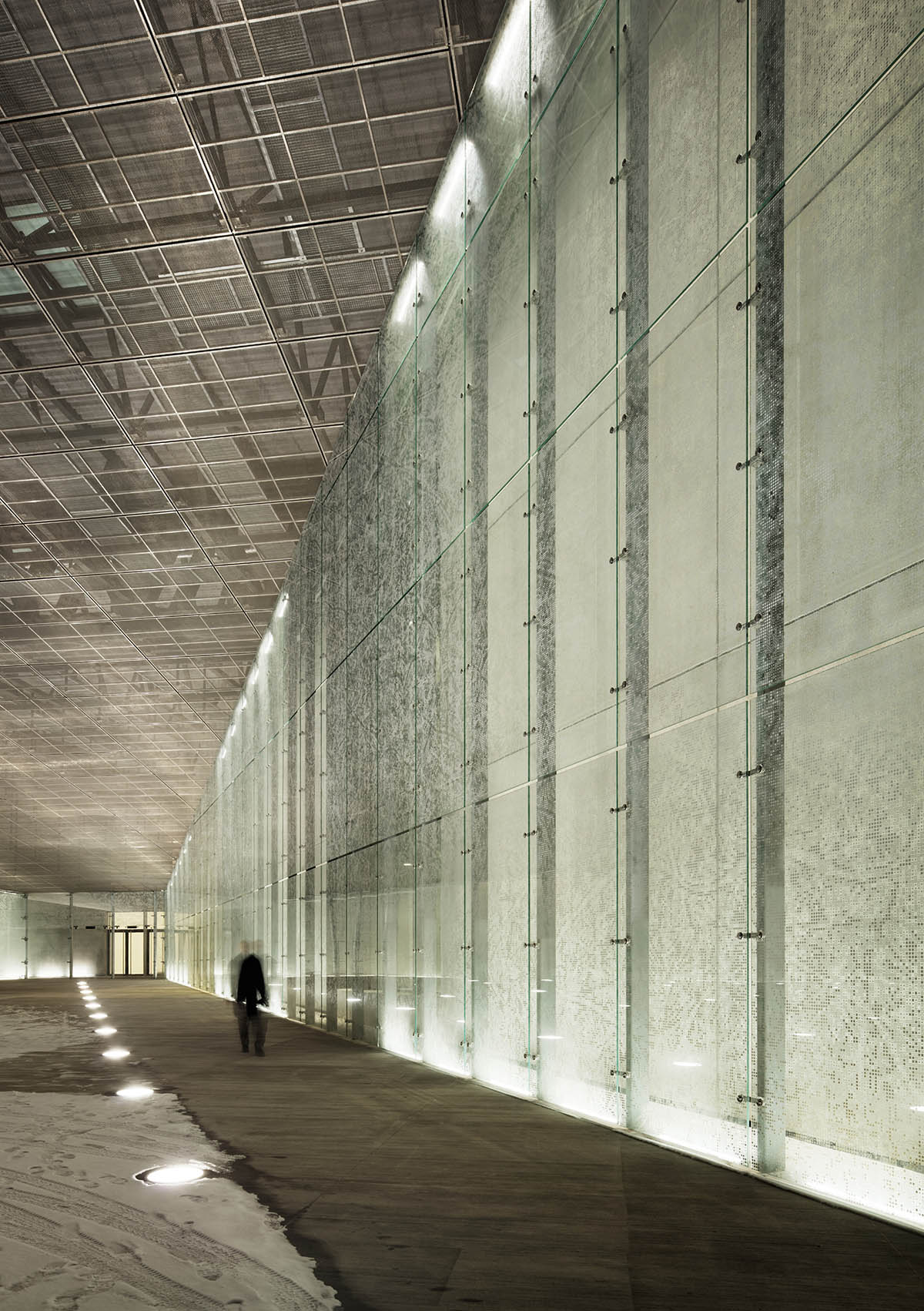 The design for the museum was created by DGT Architects - a studio of three young architects from Italy, Libya and Japan. An international competition had been launched for the building's design and construction and they astonished the commission set up to judge it with their ability to interpret the country's history and character. They chose, for example, to relocate the project to the runway of the former military base. This artificial line drawn through Tartu's beautiful natural landscapes of forests, lakes and rolling hills is a powerful symbol and the resulting building is a long ramp-shaped structure generated by the slight slant of the runway. As the building lifts off the ground it creates a series of covered spaces that house the museum's various highly functional complexes. The interiors and exteriors are separated by a light glass wall, so the only real difference between the inside and the outside is the sloping roof and the air conditioning of the environments. This means the exhibition area is in continuous visual interaction with the outside landscape thanks to a sophisticated glass buffering system that guarantees a high level of heat insulation, as well as an influx of indirect natural light on the North side, where the exhibitions and public areas are located. The Southern side of the building, on the other hand, houses offices, libraries and teaching halls that enjoy direct sunlight. The top of the building is lit by 53 W ceiling-mounted Linealuce luminaires, while 20 W floor-recessed luminaires highlight the project's main feature: the museum's glass frontage and the glass wall between the inside and outside. Both versions have Wall Grazing optics and a Neutral White colour temperature. This creates a homogeneous effect over the entire length and height of the building, whereas the museum entrance is lit by a network of Light Up Walk light points positioned under the entrance ceiling. They are all LED luminaires, so they also help reduce the building's energy consumption levels as specifically requested by the Estonian Ministry of Culture. The project was also awarded the AFEX (Overseas French Architects) prize, that recognises the excellence of French architecture around the world.