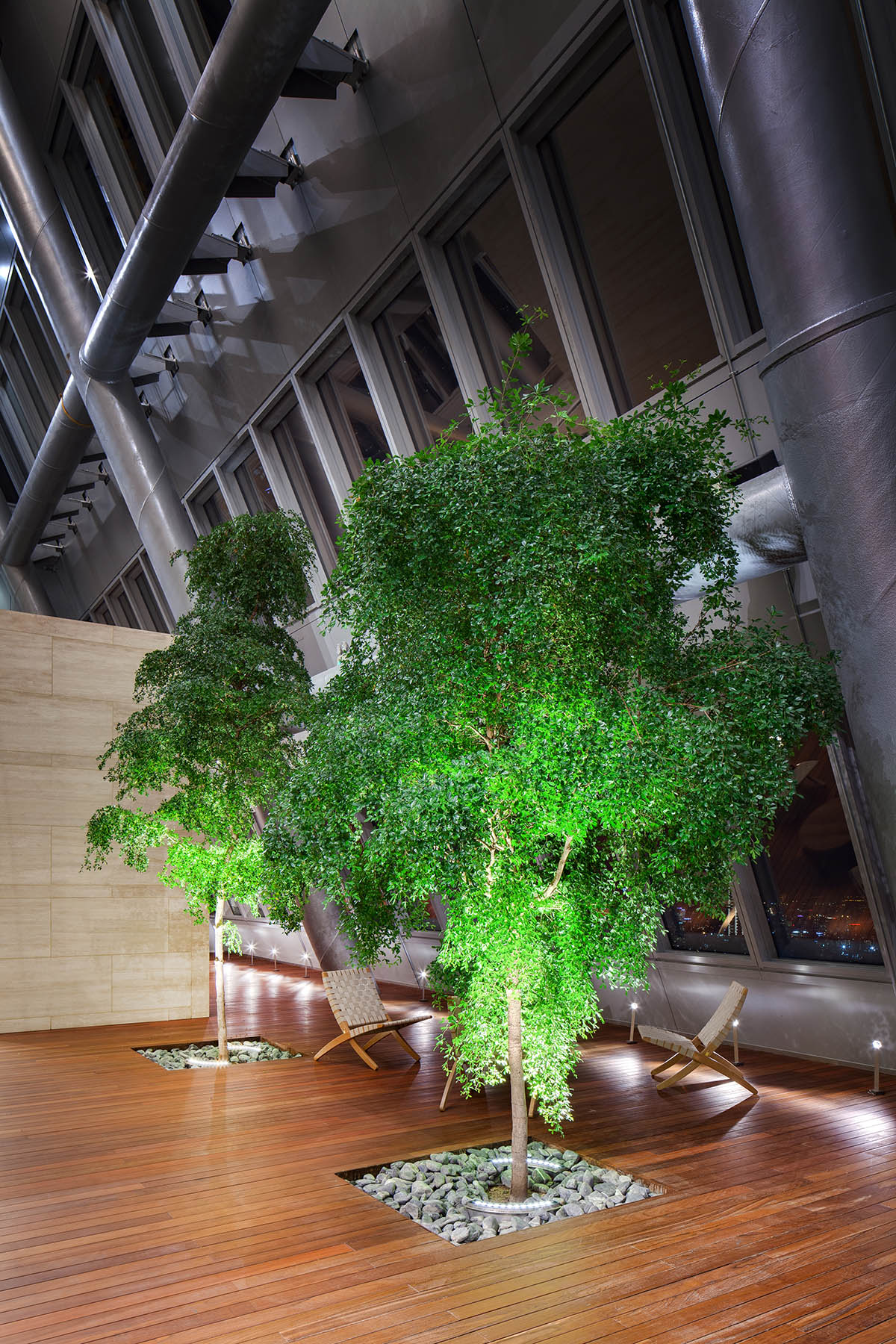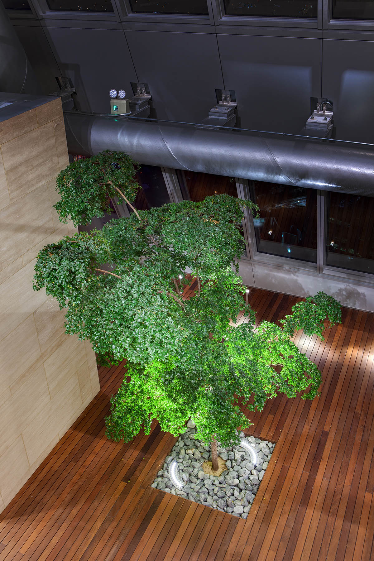 Right from the outdoor spaces, it is clear how the artificial lighting system, designed by JB&B Lighting design, has been used to project the contemporary spirit that distinguishes the bank's business practices.