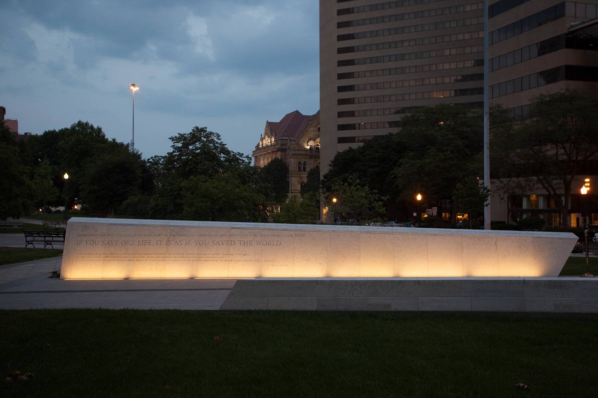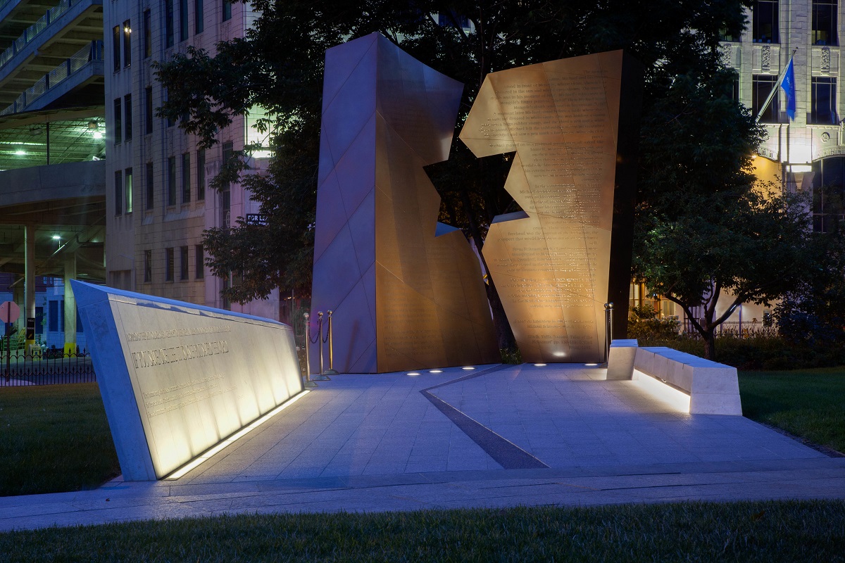 Daniel Libeskind was unveiled at the Statehouse in the centre of Columbus, Ohio. Erected at the request of the State Governor, this work deliberately seeks to perpetuate the memory of the Holocaust tragedy. The memorial consists of a long limestone base supporting 3 elements: a 5-metre high, steel outline of a shattered Star of David, two benches and a low wall with an inscription inspired by the Talmud: “If you save one life, it is as if you saved the world. In memory of the six Jewish victims who died during the Holocaust”. The sculpture also includes the story of a survivor from the Nazi death camps.