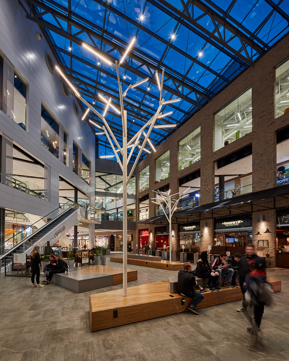 The artificial lighting is based on two luminaires: Laser Blade, positioned at irregular intervals in the false ceilings along the corridors that the shops open onto to create a feeling of movement and the pole top system Albero, which stands out in the central square, installed in the benches area, almost recalling the idea of a pleasant stop in the open air.