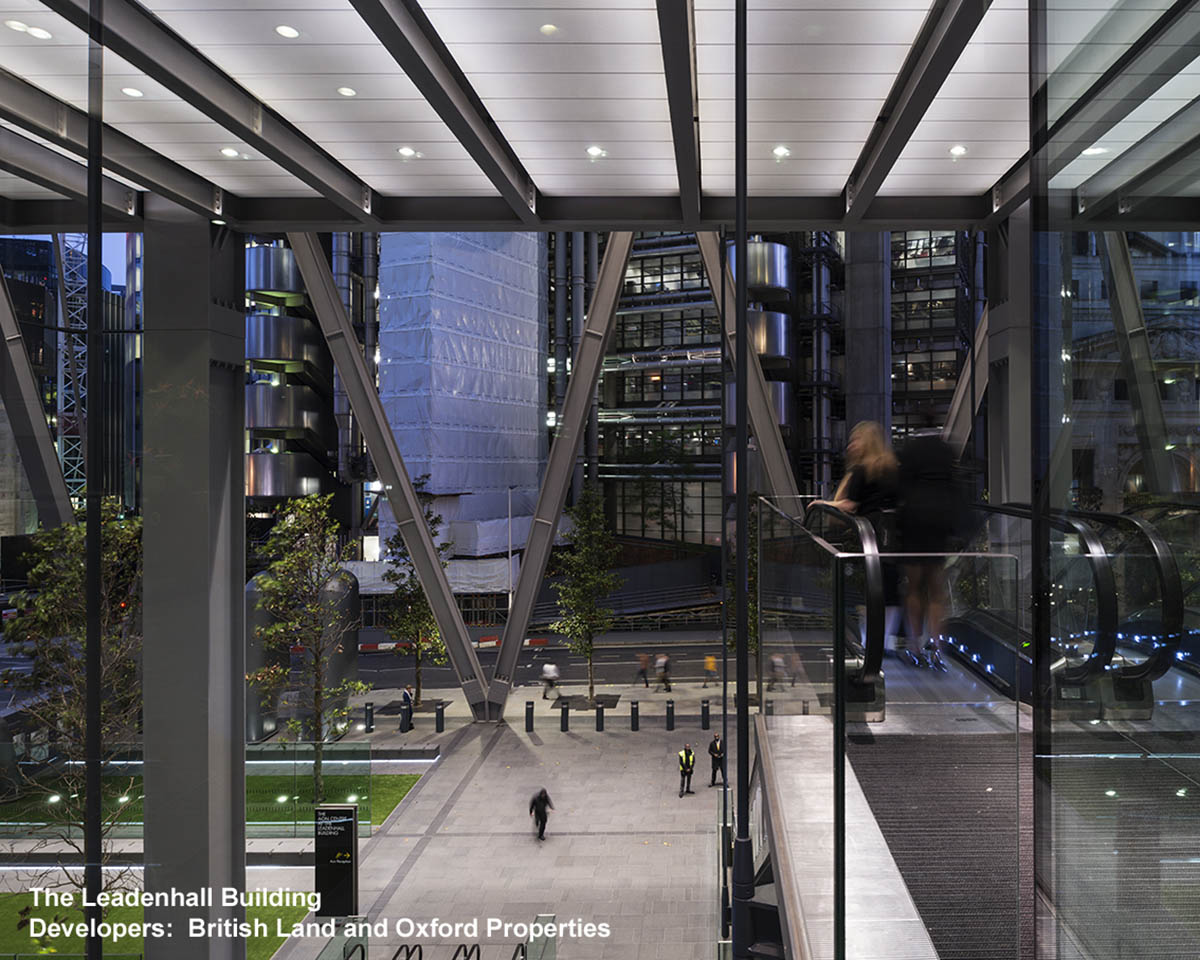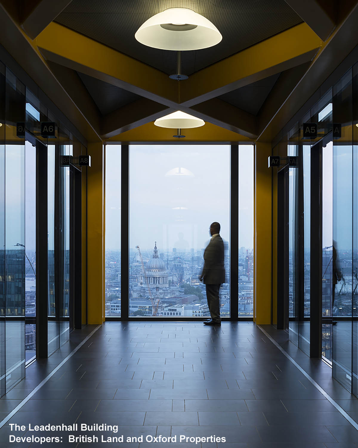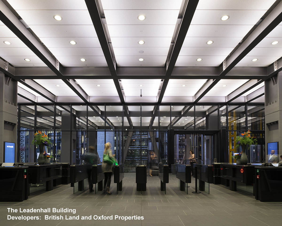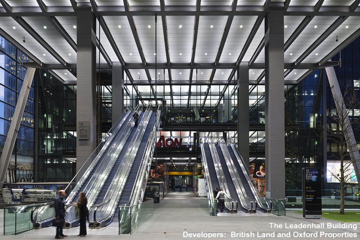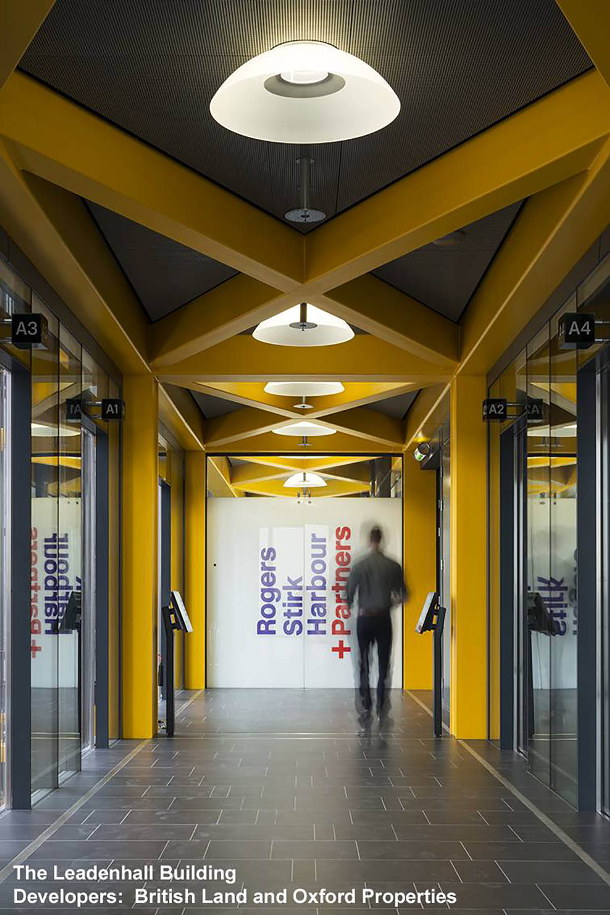 The special luminaire designed for the Leadenhall Building consists of a recessed Easy System body with a number of special attachments in which a plastic diffuser is fitted. In the corridors, toilets and general interiors in the building's North Core the luminaire has an overall diameter of 75 cm and uses 2 x 32 W compact fluorescent lamps. This creates even, diffused general lighting that ensures transit areas are safe and combines direct and indirect emissions thanks to a secondary reflector that intercepts the Easy system light flux in order to create a lighter effect on the ceiling. The same type of luminaire, designed with outdoor installation features, has also been used for the work platforms at the base of the elevators. These devices use metal halide lamps, have an overall diameter of 1.3 m, and the ceiling-mounted luminaire is a Light Up Walk Professional with a metal diffuser fitted to it. In addition to this product, Underscore luminaires have also been installed in the ceiling of what is one of London's biggest indoor plazas. These emphasize the ceiling's grid-like structure and create a background to the recessed lighting by adding to and softening the effect of the general lighting. Other devices that have been designed specifically for this project are the special Reflex recessed luminaires for the elevator access areas, an LED panel for the elevator interiors and Lineup recessed luminaires for lighting the stairs.