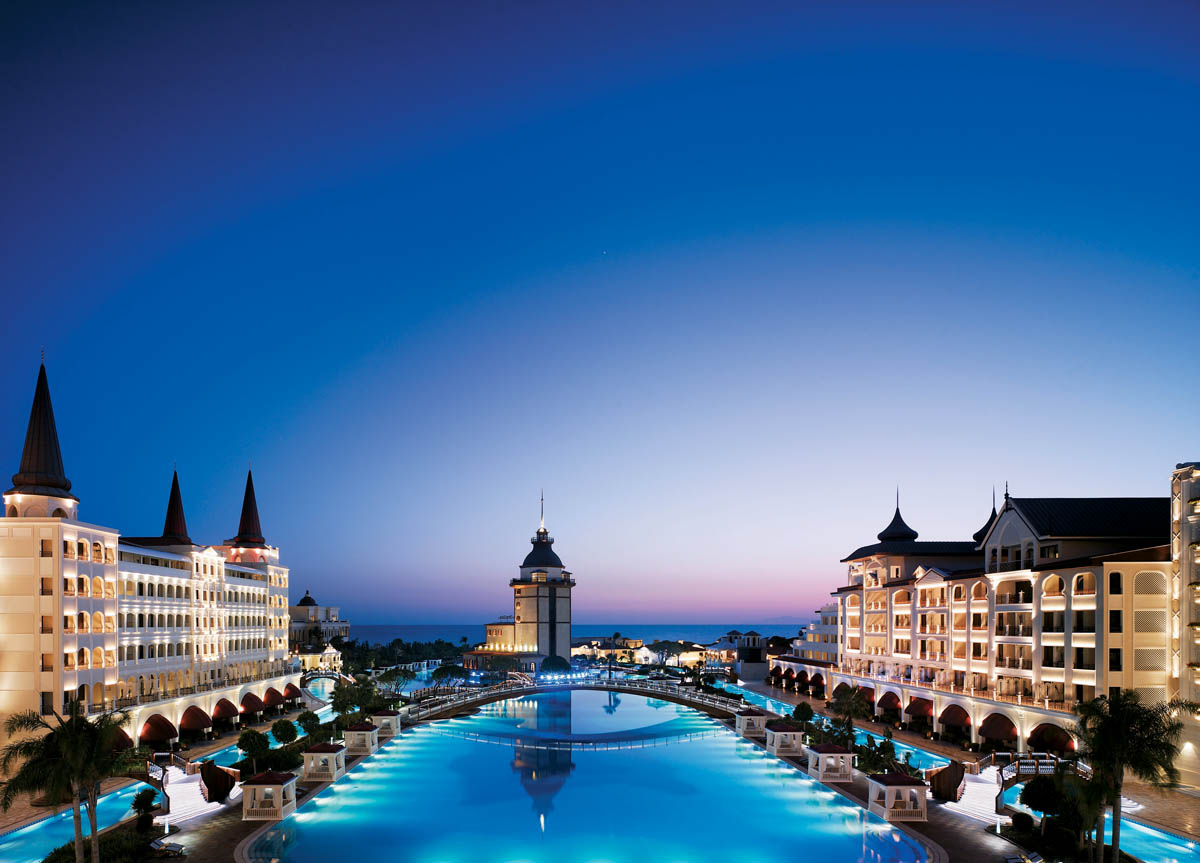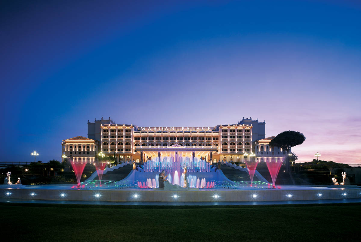 The hotel is built on the splendid Mediterranean coast of Southern Turkey, occupying a total area of 180,000 m². It is divided into wings: the Anatolian Wing, with 225 rooms - the most remarkable feature here provided by decorations in the traditional Ottoman style; the European Wing, featuring a post-modern design proclaiming simplicity, in all of the 203 rooms; and the Dolmabahce Wing, a block of 88 rooms furnished with the most luxurious pieces imaginable. The wings stand along three sides of a pool recalling the Bosphorus, straddled by a bridge based on 16th century drawings by Leonardo da Vinci for the Galata bridge, which was never built. The outer façades of the three wings are illuminated using cold cathode lighting: elsewhere, all of the hospitality lighting installation is specified with iGuzzini fixtures. Uplighting on the columns is provided by Kriss and Yota fixtures and by recessed Light Up units; the towers are lit by MaxiWoody floods; the bridge walkway is illuminated using Led sources, whilst Radius and Platea were selected for the Dolmabahçe door and the boat moorings. 64 Euclide fixtures are installed around the pool. The decorative pool on the entrance side is illuminated by Led Glim Cube units; the steps leading up to the entrance are lit by recessed Led sources, and the statues around the pool by Woody fixtures. Delphi lighting systems are used for the car park.