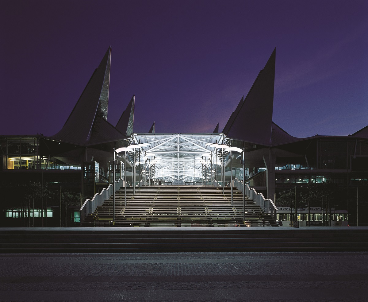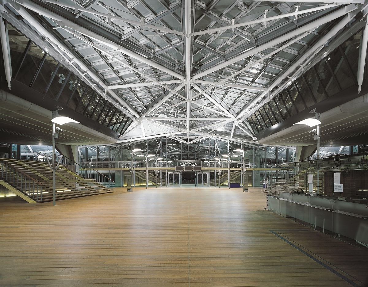 Indeed it is the wave-like appearance of the roof that characterizes the Palace of Justice: a complex three-dimensional structure composed of triangular sections, resulting from a close collaboration between Richard Rogers & Partners, Ove Arup and VK.
