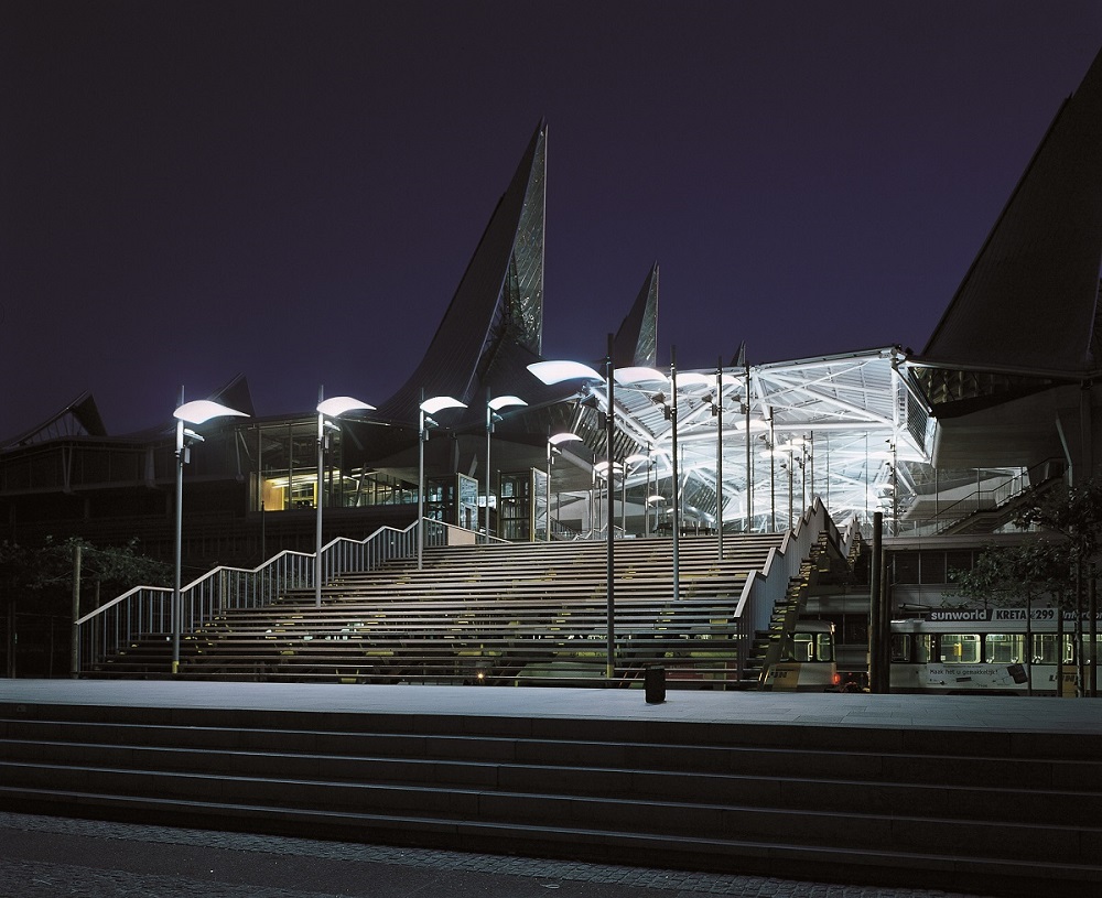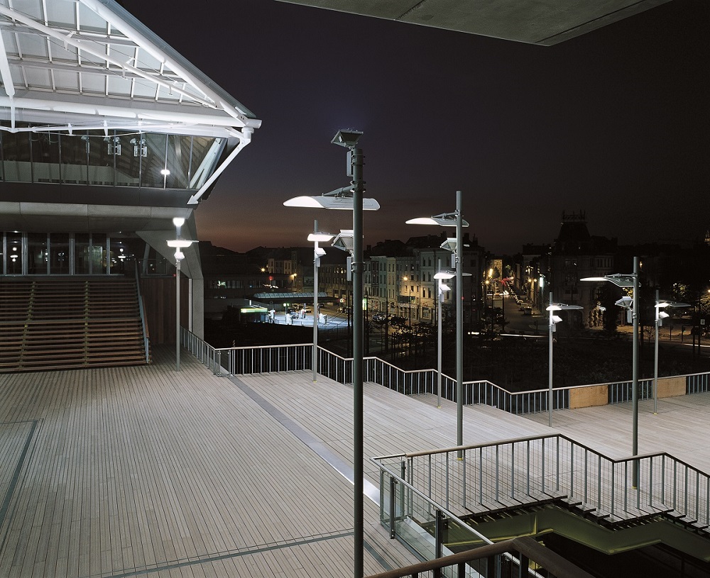 Rogers has come up with a building that does not dominate the city skyline: in reality, the structure rises no higher than the surrounding buildings, and the inclined crests of the architect’s novel roof design are reminiscent of Flemish church bell towers, or the sails on the nearby Escaut river.