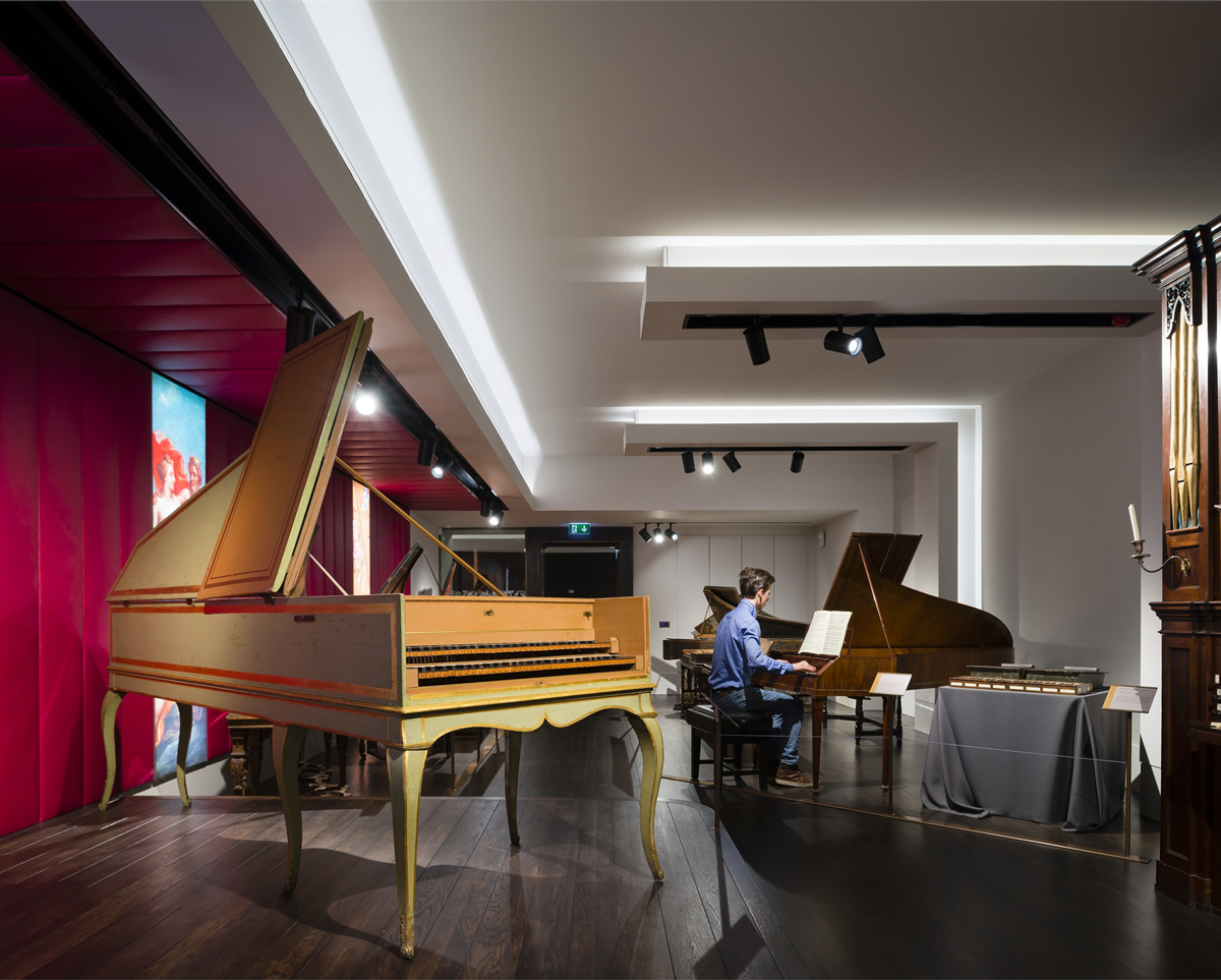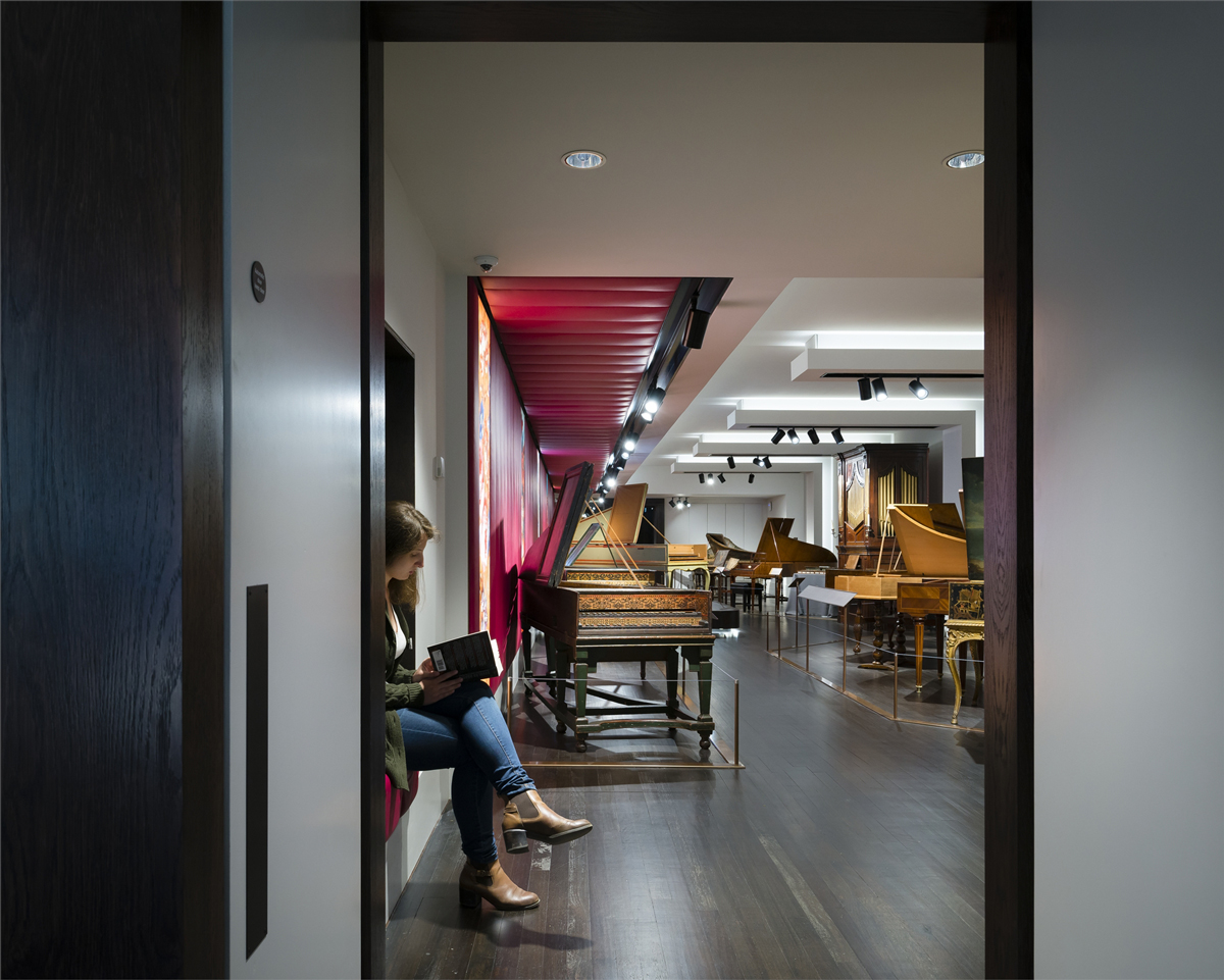 The bronze motifs on the entrance facade were also inspired by the hall’s collection, and more specifically, the highly decorated soundboard of a 1725 Francis Coston double-manual harpsichord.