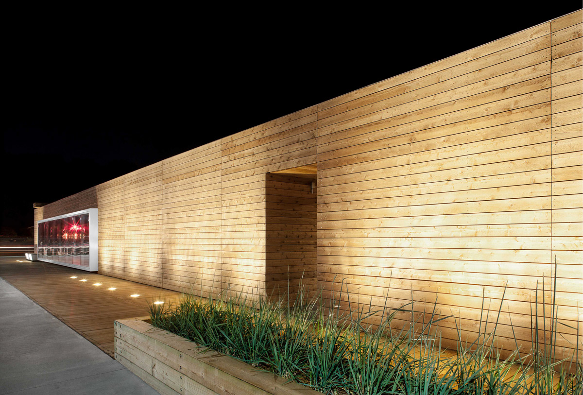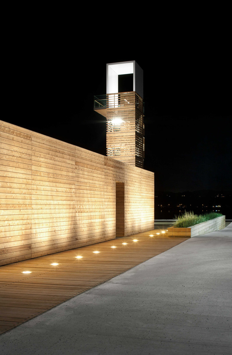 The wharf of Cageux remembers the 19th century historical work of manual labourers who took care of the transport of wood along the St Lawrence river. The term “Cageux” means that the wood was transported using floating crates: this word subsequently became the nickname of the drivers of these crates. The wharf itself is situated on the St Lawrence river amid the hub of bustling port activities in Quebec, Canada. Using contemporary design, inspired by the old shipyards, the construction is made entirely of wood, and is illuminated with 3000K light provided by LightUp Walk with assymetric optic to create a warm iconic glow. There is also an observation tower within the wharf, more than 20 metres high, where Linealuces, still with the warm 3000k, wash the inside white walls, resembling the image of a lighthouse.