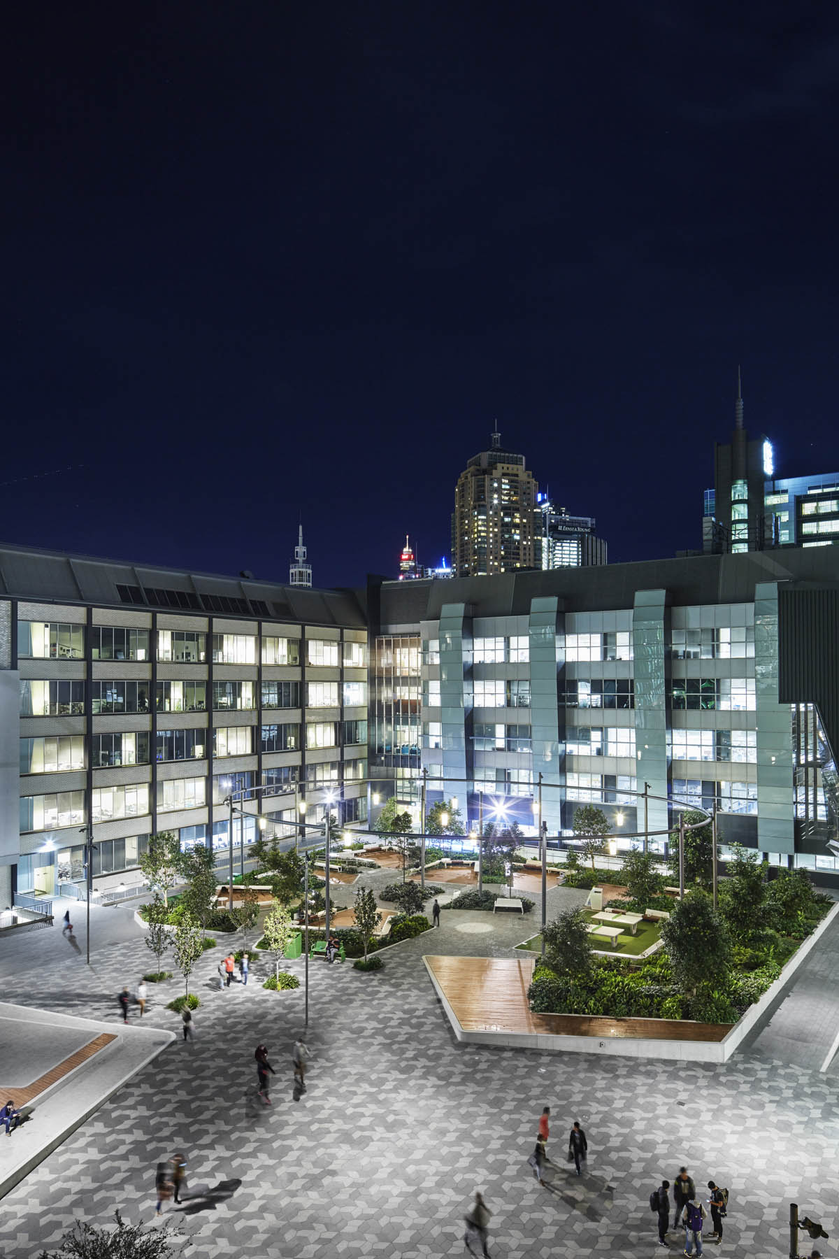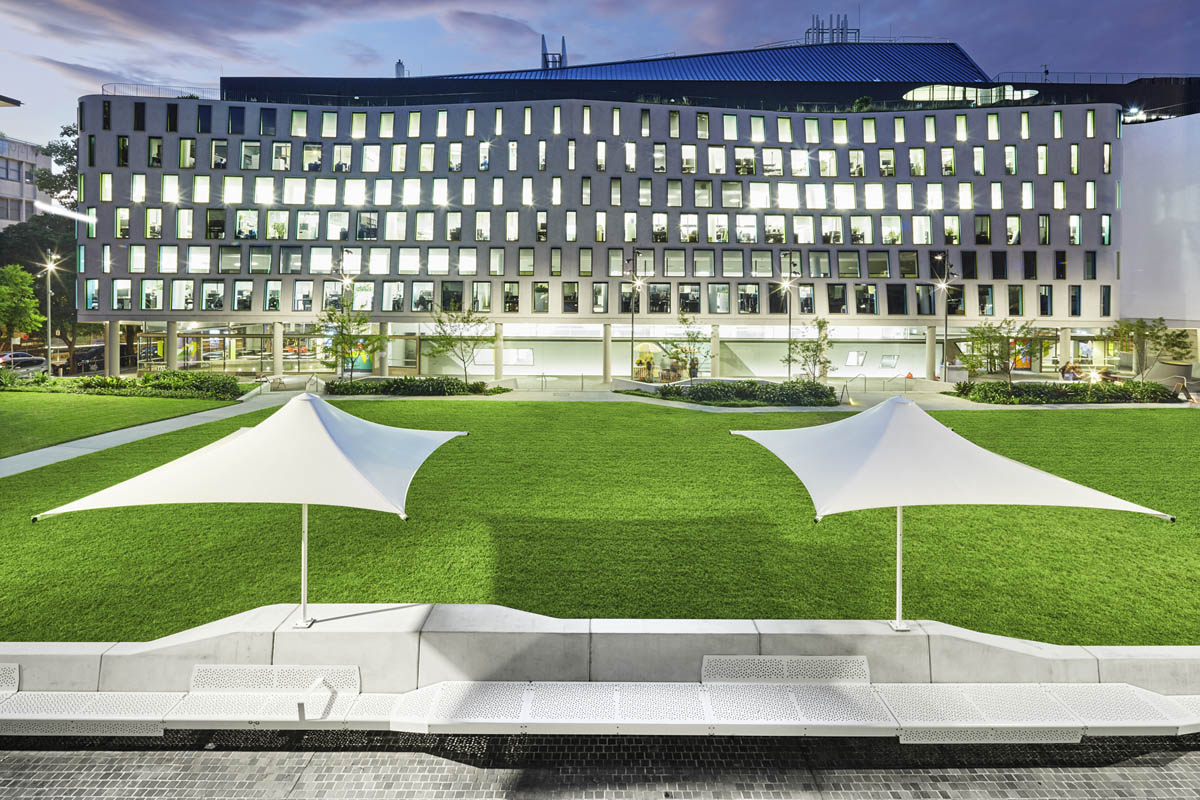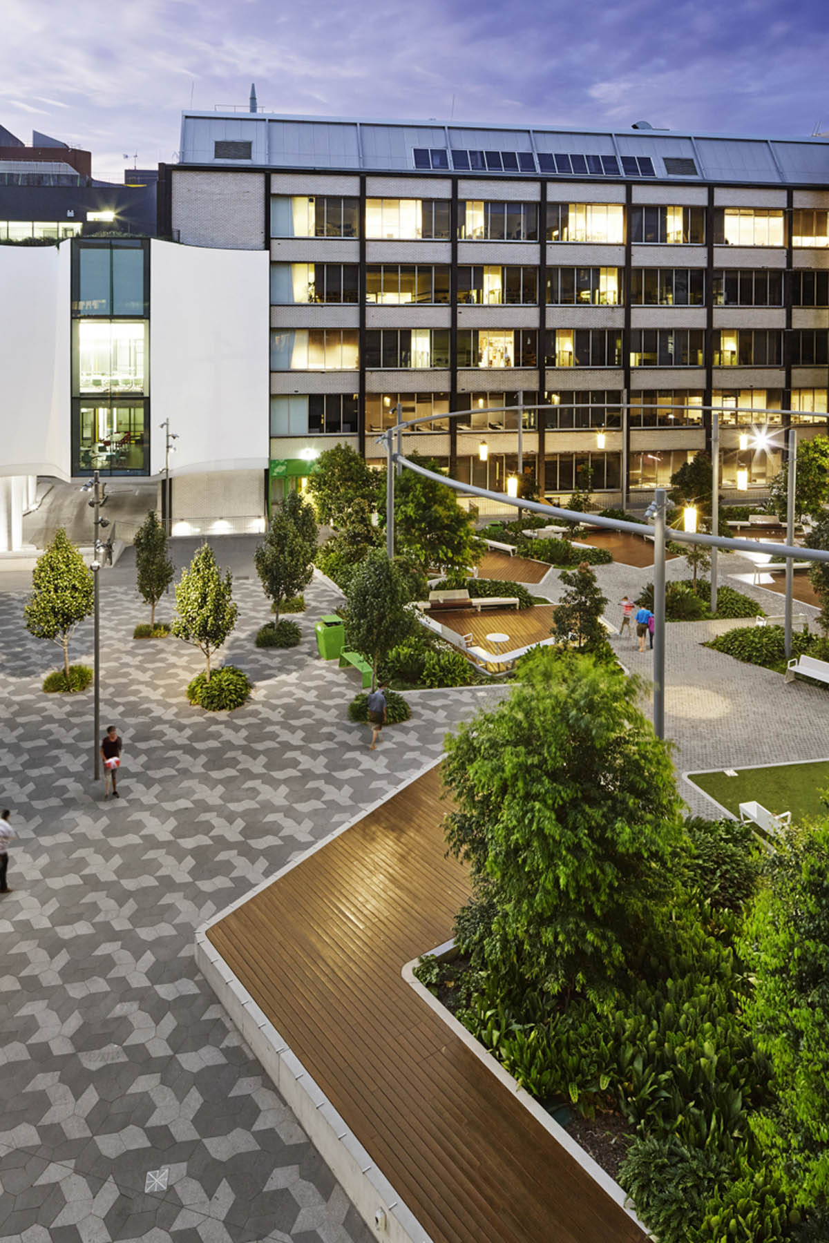 “The Green” is a large, raised turf platform that can be used for both special events and informal daily activities, while its shaped edges offer informal seating areas. “The Heart” is modelled after town squares like Federation Square in Melbourne and the Pompidou Centre in Paris and is a ceremonial gathering space for students and visitors. “The Garden” is a mini oasis of trees and plants shading a series of connected student ‘pods’. Each pod contains facilities ranging from power outlets for laptops, BBQ facilities and even table tennis tables. Further to Alumni Green, UTS also engaged ASPECT Studios to create an extensive green roof on top of the new DBJ / BVN science building, which provides the building with positive environmental benefits as well as another opportunity for enjoying social engagement and a break in the open air.